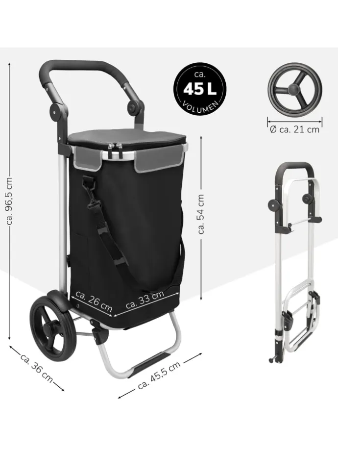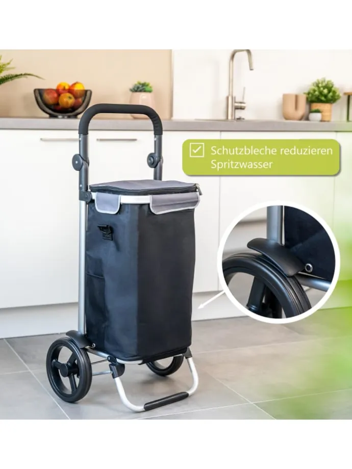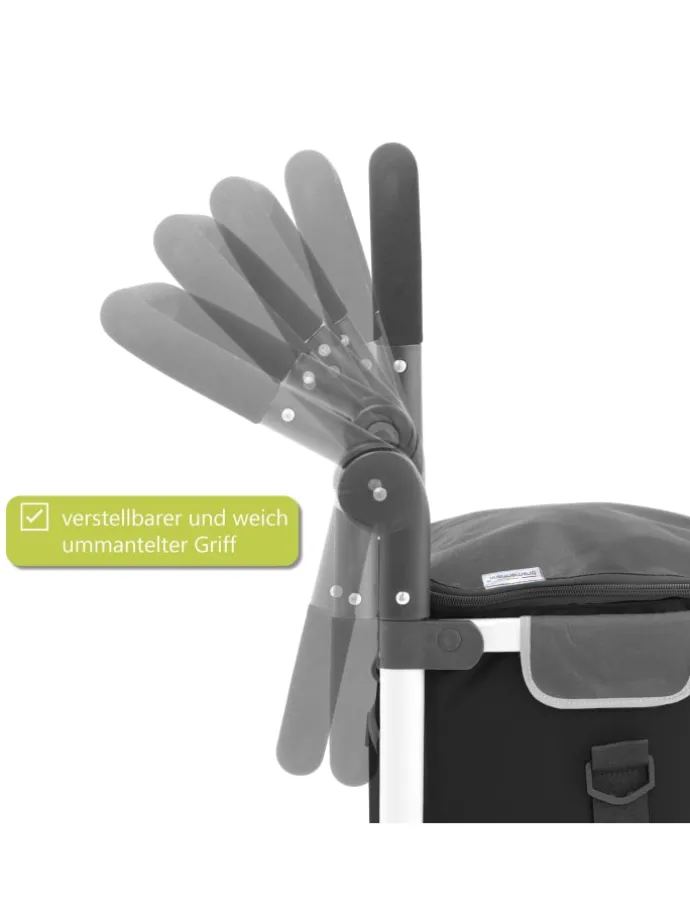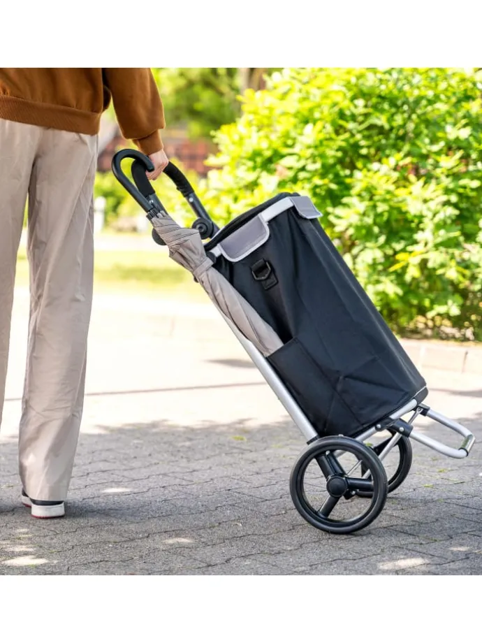 Beim Einkaufen befestigen Sie den Trolley einfach mithilfe der 2 installierten Haken vorne an den Einkaufswagen, Der Einkaufstrolley beansprucht also keinen Platz, den Sie für Ihre Einkäufe im Einkaufswagen benötigen. Nach dem Bezahlen wandern die Einkäufe vom Einkaufswagen in den Trolley und Sie beginnen ganz unkompliziert Ihre Heimfahrt. Im Auto ist der Einkaufstrolley durch die kompakte Bauweise selbst in Kleinwagen schnell verstaut. Dank der großen Räder schaffen Sie auch mühelos den Schritt in den Bus oder die Straßenbahn.
