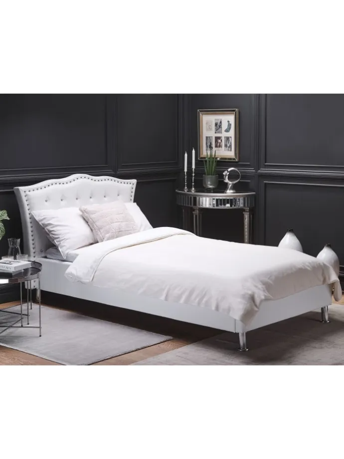 Romantisches Kunstlederbett in stilvollem Weiß mit praktischem Bettkasten. Das wunderschöne Kunstlederbett bietet Romantik und Eleganz pur! Die exklusive Ausstrahlung, das angenehm gepolsterte und wunderschön geschwungene Kopfteil mit der eleganten Knopfverzierung und den dekorativen Steppnähten sowie die schicken, verchromten Füße runden das stilvolle Design ab. Das Einzelbett hat einen strapazierfähigen und pflegeleichten Bezug aus hochwertigem Kunstlederbett in edlem Weiß. Das Highlight des Betts ist der praktische und geräumige Bettkasten, der Ihnen unglaublich viel Stauraum bietet.