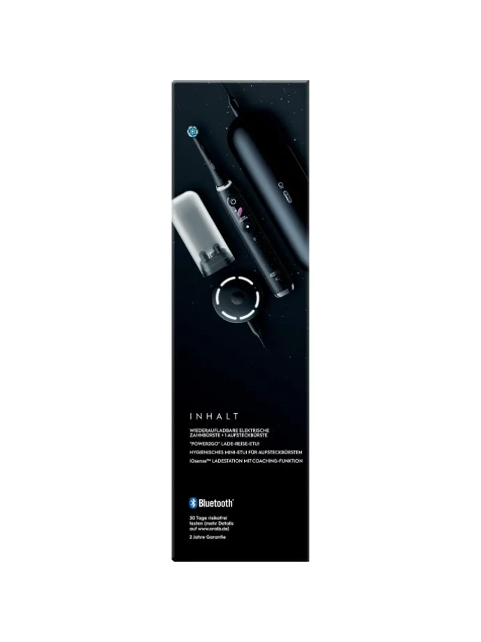 Im Lieferumfang enthalten: 1x Handstück, 1x Aufsteckbürste, 1x Lade-Reiseetui, 1x Ladestation, 1x Mini-Etui für Aufsteckbürsten + 12 Oral-B iO Black Sanfte Reinigung Aufsteckbürsten (aus hygienischen Gründen einzeln verpackt)•