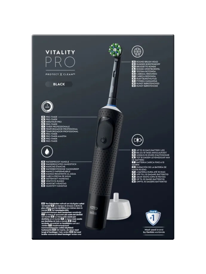 Die Oral-B Vitality Pro wiederaufladbare elektrische Zahnbürste bietet eine klinisch bestätigte überlegene Reinigung im Vergleich zu herkömmlichen Handzahnbürsten. Die Vitality Pro verfügt über 3 Putzprogramme: Tägliche Reinigung, Sensitiv und Sensitiv-Plus für ein erstaunlich sanftes Zahnputzerlebnis. Der Timer im Handstück unterstützt Sie dabei, die vom Zahnarzt empfohlene Putzzeit von 2 Minuten einzuhalten. Oral-B – die Zahnbürstenmarke, die Zahnärzte weltweit am häufigsten selbst verwenden.