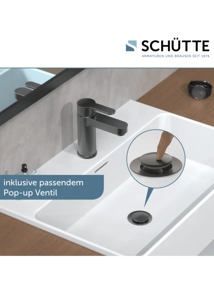 Der Wasserhahn Bad verfügt über eine Waschbecken Ablaufgarnitur mit Pop Up Ablaufventil. Bequem per Fingerdruck den Abflussstopfen öffnen und schließen. Passend zu allen Waschtisch-Siphons mit 11/4“ – Ø ca. 4 cm Anschluss.