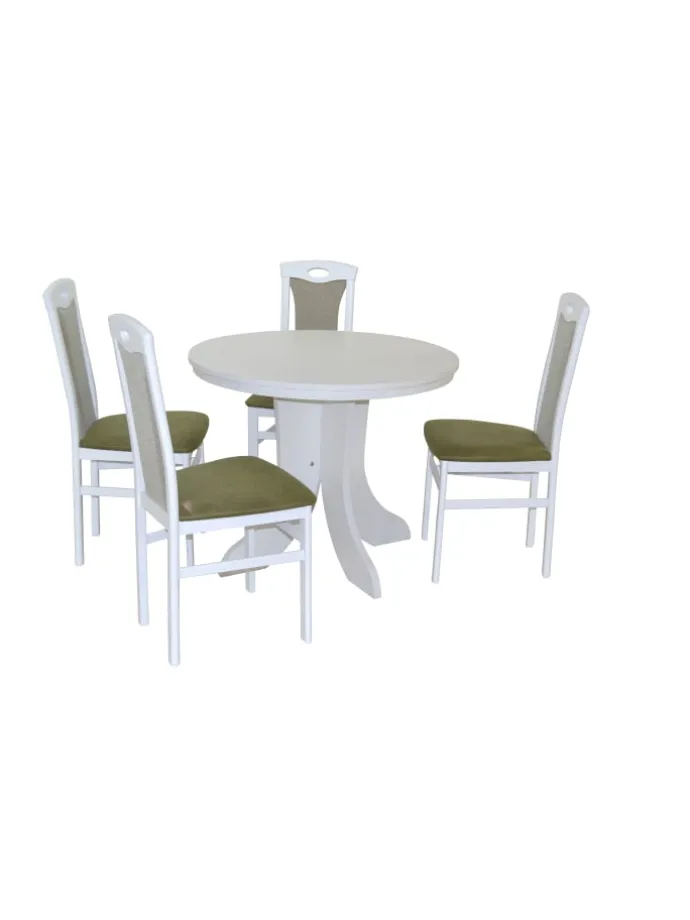 Hochwertige 5tlg. Essgruppe bestehend aus 4 Massivholzstühlen und 1 Esstisch. Stühle aus Massivholz Buche, weiß lackiert. Sitz und Rücken sind bequem schaumstoffgepolstert und mit attraktiven Stoffbezügen bezogen. Sitz mit einem Bezug in Kunstlederoptik (100% Polyester), Rücken mit einem Strukturstoffbezug (90% Polyester/10% Rayon). Praktisch die eingearbeitete Griffmuschel im oberen Rückenbereich. Esstisch mit einem modernen, stabilen Gestell komplett aus Holzwerkstoff gefertigt und mit einem strapazierfähigen, pflegeleichten Melamin-Holzdekor, weiß, beschichtet. Die runde Tischplatte ist ausziehbar und lässt sich durch die mitgelieferte ca. 40 cm breite Einlegeplatte von 90 cm auf 130 cm vergrößern. Die Stühle werden montiert angeliefert, der Esstisch flach verpackt zur Selbstmontage, inklusive Aufbauanleitung. Maße ca. cm je Stuhl: (B/H/T) 45/95/48. Sitzhöhe ca. 46 cm, Sitztiefe ca. 39 cm. Maße ca. cm Esstisch: (ØxH) 90×75 cm bis auf 130 cm Breite vergrößerbar. Einlegeplatte lässt sich nicht unter der Tischplatte verstauen.