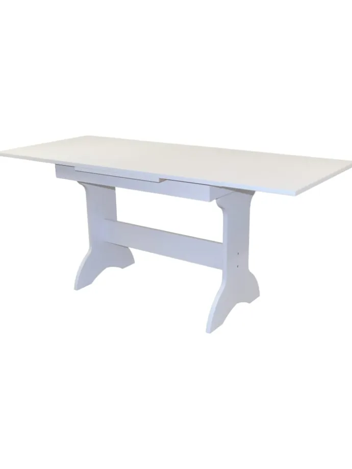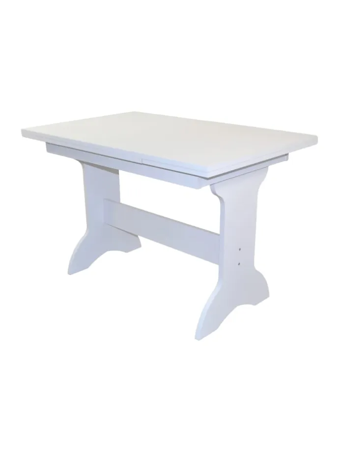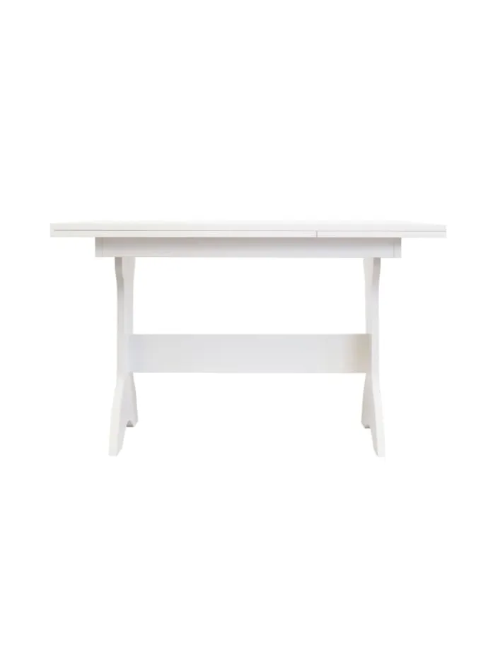 Hochwertige 5tlg. Essgruppe bestehend aus 4 Massivholzstühlen und 1 Esstisch mit zwei Ansteckplatten zum Vergrößern. Stühle aus Massivholz Buche, weiß lackiert. Sitz und Rücken sind bequem schaumstoffgepolstert und mit attraktiven Stoffbezügen bezogen. Sitz mit einem Bezug in Kunstlederoptik (100% Polyester), Rücken mit einem Strukturstoffbezug (90% Polyester/10% Rayon). Praktisch die eingearbeitete Griffmuschel im oberen Rückenbereich. Esstisch mit zwei Ansteckplatten (je ca. 30 cm breit), die rechts/links unter der Tischplatte eingeschogen sind, dadurch lässt sich die Tischplatte einfach und schnell von 110 cm bis auf 170 cm vergrößern. Gestell vom Esstisch aus Massivholz Buche, weiß lackiert. Platten aus Holzwerkstoff die mit einem pflegeleichten Melamin-Holzdekor, weiß, beschichtet sind. Die Stühle werden montiert angeliefert, der Esstisch flach verpackt zur Selbstmontage, inklusive Aufbauanleitung. Maße ca. cm je Stuhl: (B/H/T) 45/95/48. Sitzhöhe ca. 46 cm, Sitztiefe ca. 39 cm. Maße ca. cm Esstisch: (B/H/T) 110-170/75/70.