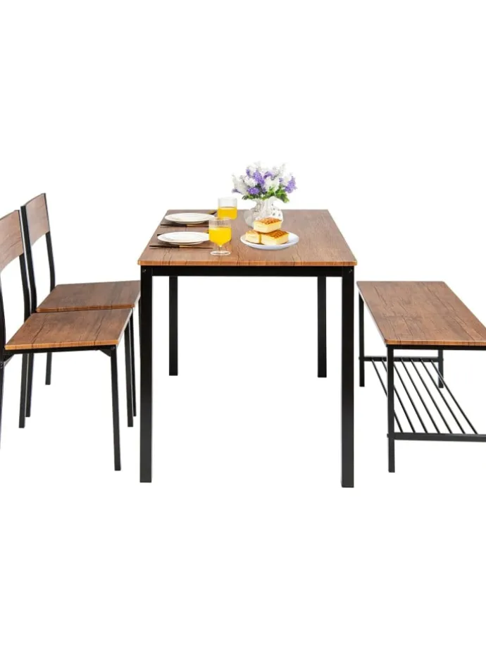 Unser 4-teiliges modernes Esstischset ist eine ideale Ergänzung für Ihr Zuhause und optimal für Zusammenkünfte mit Familie & Freunden. Dieses Esstisch-Set ist mit einem geräumigen Tisch, einer großen Bank und 2 ergonomischen Stühlen ausgestattet und ermöglicht das Zusammensitzen von 4 Personen. Ausgestattet mit langlebigem MDF und stabilem Metallrahmen sorgt dieses Tischset für hohe Stabilität und langfristige Nutzung. Sein industrieller Stil passt zu verschiedenen Innendekorationen. Darüber hinaus kann dieses moderne Set als Schreibtisch im Arbeitszimmer und als Kommode im Schlafzimmer verwendet werden, wodurch alle Ihre Anforderungen erfüllt werden. Außerdem können die Stühle und die Bank unter dem Tisch verstaut werden, was ideal für die Nutzung bei begrenztem Wohnraum ist. Kurz gesagt, dieses Esstischset bietet Ihnen sowohl Funktionalität als auch Attraktivität.