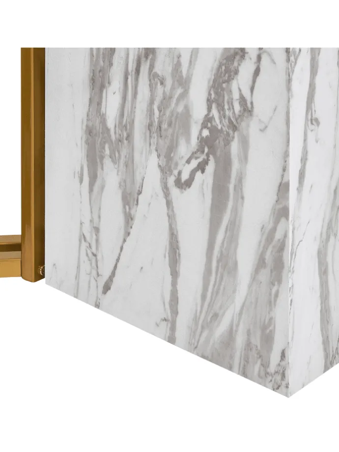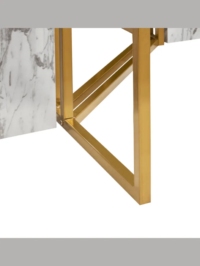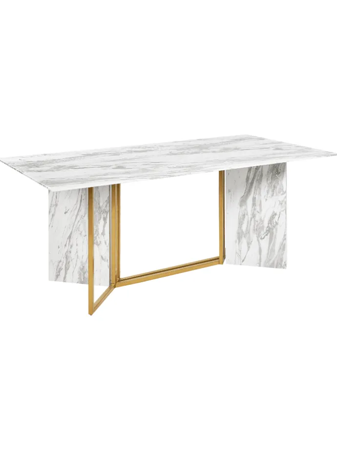 Glamouröser Esstisch mit Marmor-Effekt und goldenem Gestell. Tauchen Sie in die Eleganz dieses opulenten Esstisches ein, der reichlich Platz für bis zu 8 Personen bietet. Die MDF-Tischplatte in Marmoreffekt strahlt puren Glamour aus und ist zusätzlich mit gehärtetem Glas für Langlebigkeit versehen. Unter der Tischplatte strahlen Metallbeine in glänzendem Gold und heben die moderne Ästhetik hervor. Dieser Tisch ist mehr als nur Möbelstück – er ist der Inbegriff von Eleganz und eine stilvolle Mischung aus Luxus und modernem Flair. Verwandeln Sie Ihren Essbereich in eine Oase stilvoller Treffen und unvergesslicher Gespräche.