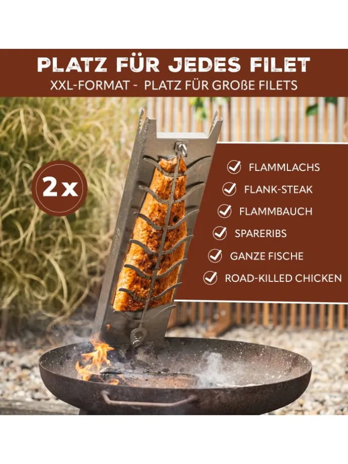 Jedes der 2 hochwertigen Flammlachsbretter aus Edelstahl ist die perfekte Lösung für die Zubereitung von klassischem Flammlachs, für Flanksteak, flambierten Schweinebauch, Roadkill-Chicken und vielen weiteren Grill-Spezialitäten. Dank durchdachter Konstruktion bieten sie maximale Flexibilität, Stabilität und Komfort – sowohl am Feuer als auch beim Servieren.