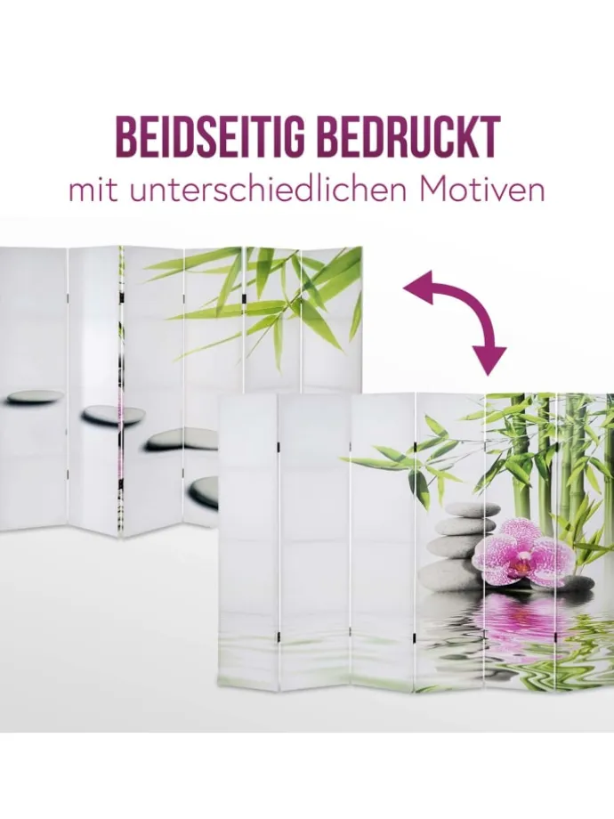 Unsere Motiv-Raumteiler, bestehend aus bedrucktem Stoff auf einem Holzrahmen, unterteilen Räume nicht nur einfach, sondern vergrößern die einzelnen Teile optisch enorm. Die ausgewählten Motive lassen Sie sich in ihnen verlieren und wirken wie ein Fenster, in eine andere Welt. Der Clou: die Artikel sind beidseitig bedruckt, sodass jeder neue Raum über einen individuellen Ausblick verfügt.