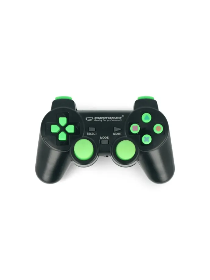 Kabelloses Pad für Computer und PS3 mit doppeltem Vibrationssystem . Es verfügt über 12 Funktionstasten und zwei analoge Knöpfe. Es kommuniziert mit dem Gerät über den Empfänger.