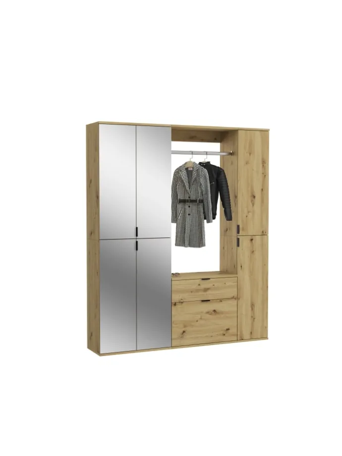 Verleihen Sie Ihrem Flur, Ihrer Diele, Ihrem Hauswirtschaftsraum, Ihrem Büro und Ihrem Schlafzimmer mit unserer Garderobenkombination in Artisan Eiche Nachbildung eine stilvolle Note. Das natürliche Holzdesign schafft eine warme und einladende Atmosphäre, während die Option mit Spiegelglas zusätzliche Eleganz und Helligkeit in den Raum bringt. Mit ausreichend Stauraum ist diese Garderobenkombination die perfekte Wahl für eine organisierte und ästhetische Einrichtung.