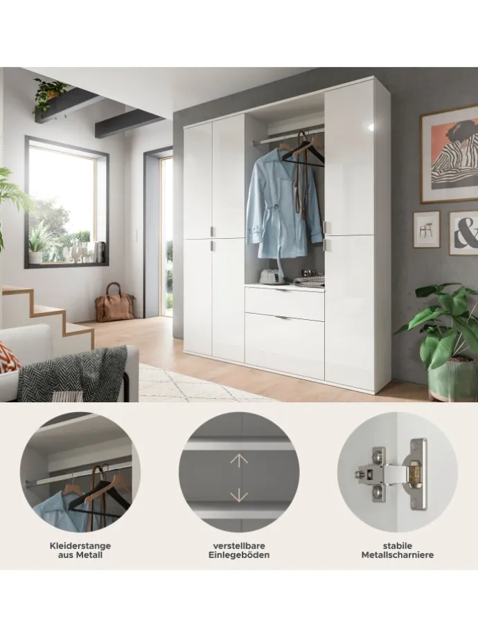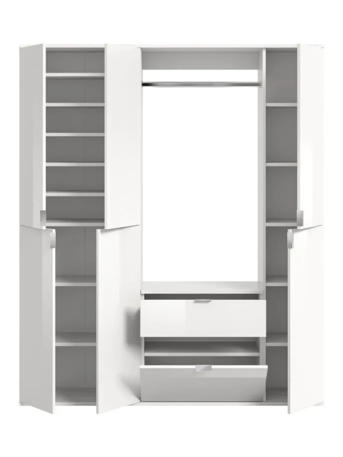 Garderobenkombination (B/H/T: 152x193x34 cm) in weiß und weiß Hochglanz