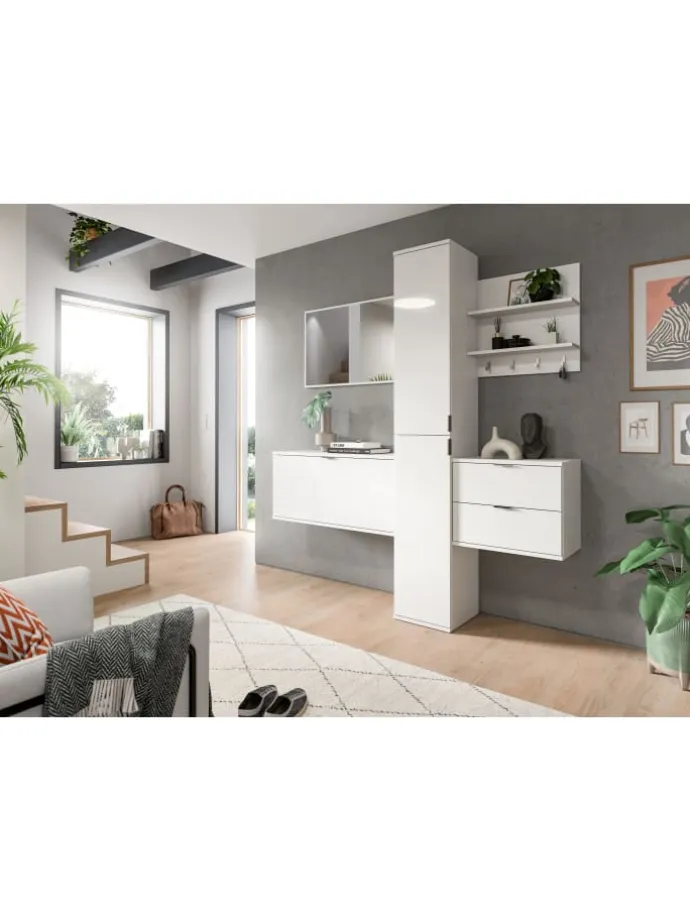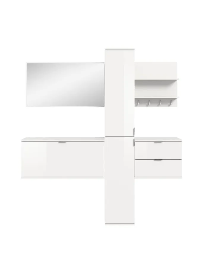 Entdecken Sie unsere beeindruckende Garderobenkombination (B/H/T: 174x191x37 cm) in elegantem Weiß Hochglanz. Sie bringt nicht nur einen modernen Look in Ihren Flur, sondern überzeugt auch durch ihre durchdachte Funktionalität. Diese stilvolle Kombination besteht aus einem großen Spiegel, der Ihren Eingangsbereich optisch vergrößert, sowie einer praktischen Sitzbank, die gleichzeitig als Kommode dient – perfekt für Ihre Sachen. Der vielseitige Hochschrank bietet zusätzlichen Stauraum für Jacken, Schuhe und Accessoires. Das schicke Paneel rundet das Ensemble ab und sorgt dafür, dass Sie alles Nötige zur Hand haben, während es Ihren Flur aufwertet. Ob beim Eintreten oder Verlassen des Hauses, diese Garderobenkombination vereint Ordnung und Stil. Perfekt für alle, die einen modernen, minimalistischen Wohnstil schätzen oder einfach nur eine praktische Lösung für ihren Flur suchen. Holen Sie sich diese Garderobenkombination und verwandeln Sie Ihren Eingangsbereich in einen einladenden Raum!
