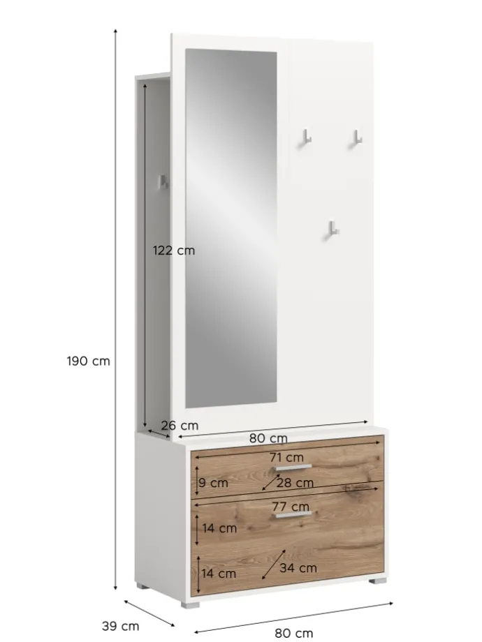 Erleben Sie die perfekte Kombination aus Funktionalität und Stil mit unserer großzügigen Garderobenkombination! Mit Abmessungen von 80 x 190 x 38 cm verfügt dieses Modell über einen Schubkasten, eine Klappe, eine Garderobenstange, sechs Haken und sieben höhenverstellbare, herausnehmbare Einlegeböden sowie zwei Fächer hinter der Klappe und einen Ablageboden. Die hochwertig verarbeitete, pflegeleichte Oberfläche mit großer Spiegelfläche macht diese Garderobenkombination zu einem idealen Highlight in jedem Flur, während sie gleichzeitig viel Stauraum für Jacken, Accessoires und mehr bietet. Perfekt für Familien und stilbewusste Haushalte!