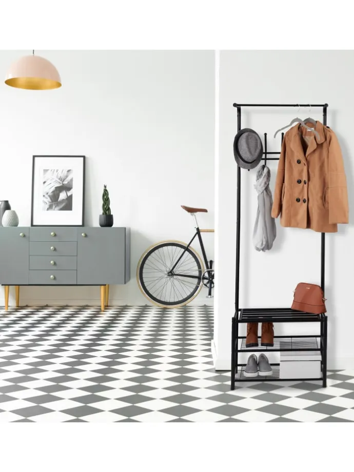 Bringen Sie Ordnung in Ihr Jacken-Chaos. Mit dieser schicken Standgarderobe sorgen Sie für Stauraum in der Diele. An den 5 Doppelhaken haben Sie ausreichend Platz zum Aufhängen von Jacken, Mänteln oder Mützen. Und auf den 3 Ebenen stehen Ihre Schuhe stets griffbereit. Die freistehende Kleiderablage mit integriertem Schuhregal kann beliebig im Raum platziert werden und kommt ohne Bohren aus. Durch das angesagte Industrial Design fügt sich die Kleiderstange in jede Wohnungseinrichtung ein.