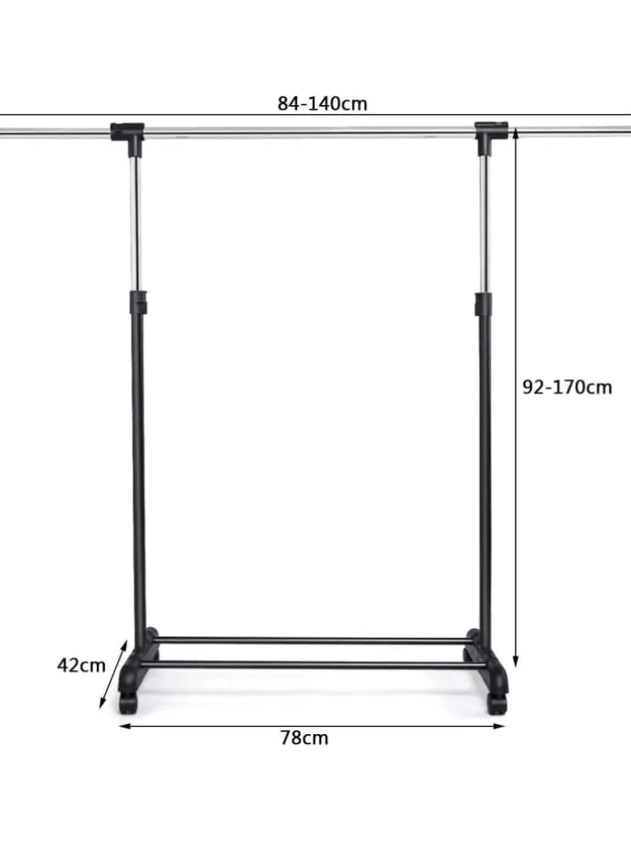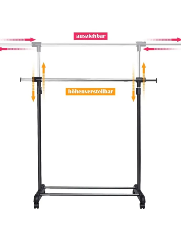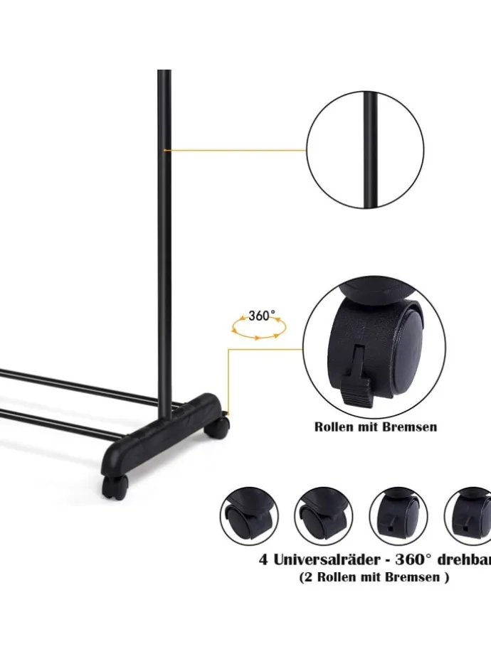 Der praktische Kleiderständer kann durch seine leicht laufenden Rollen schnell und einfach an einen passenden Ort platziert werden. Der stufenlos vertikal und horizontal verstellbare Kleiderständer kann variabel zum Aufhängen von Hemden ebenso wie Mänteln eingesetzt werden.