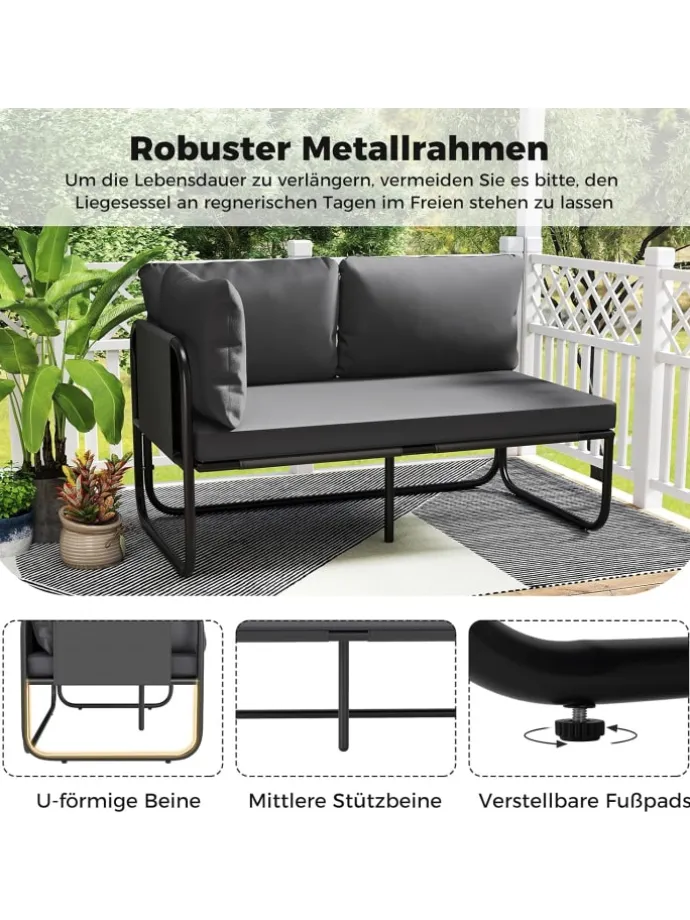 Gefertigt mit einem robusten Metallrahmen, ist die Outdoor-Bank stabil und langlebig. Der atmungsaktive, verschleißfeste und farbbeständige Stoff sorgt für ein kühles Sitzgefühl und eine langfristige Nutzung. Das weiche, mit Baumwolle gepolsterte Sitzkissen und die Kissen bieten optimalen Komfort. Die seitlichen Armlehnen sorgen für zusätzlichen Komfort. Mit einer geräumigen Sitzfläche können Sie mit Freunden im Garten, auf der Veranda, am Pool und mehr sitzen. Um die Lebensdauer zu verlängern, bitte den Zweisitzer bei Regen nicht draußen lassen.