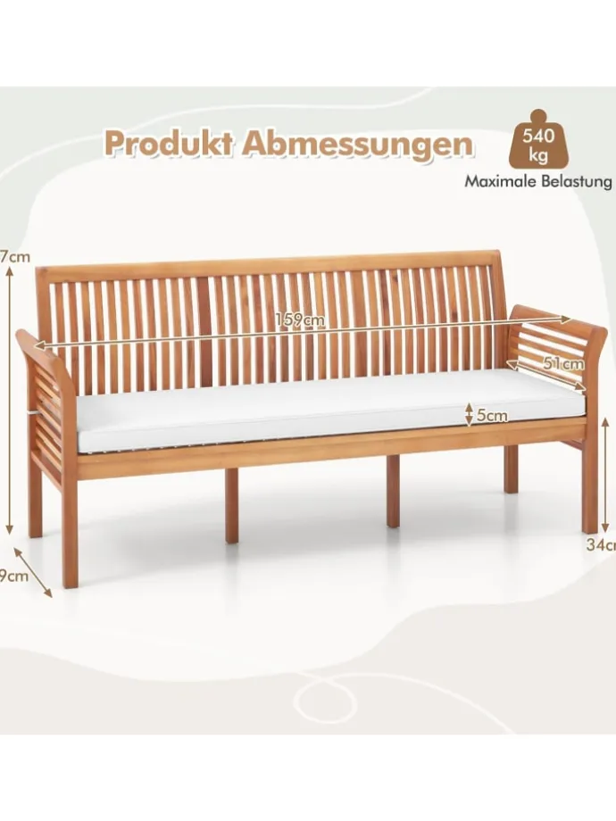 Hergestellt aus hochwertigem Akazienholz, das für seine Langlebigkeit bekannt ist, zeichnet sich diese Bank durch ihre natürliche Gratfreiheit und ihre robuste Stabilität aus. Das abnehmbare Kissen mit hochdichtem Schaumstoff bietet zusätzlichen Komfort, während der leicht zu reinigende, mit Reißverschluss versehene Bezug und die sicheren Bänder die Bequemlichkeit erhöhen. Ergonomisch gestaltet mit Rückenlehne und geschwungenen Armlehnen sowie Stützbeinen für eine beeindruckende Tragfähigkeit von 540 kg verspricht diese Bank Entspannung ohne Kompromisse.