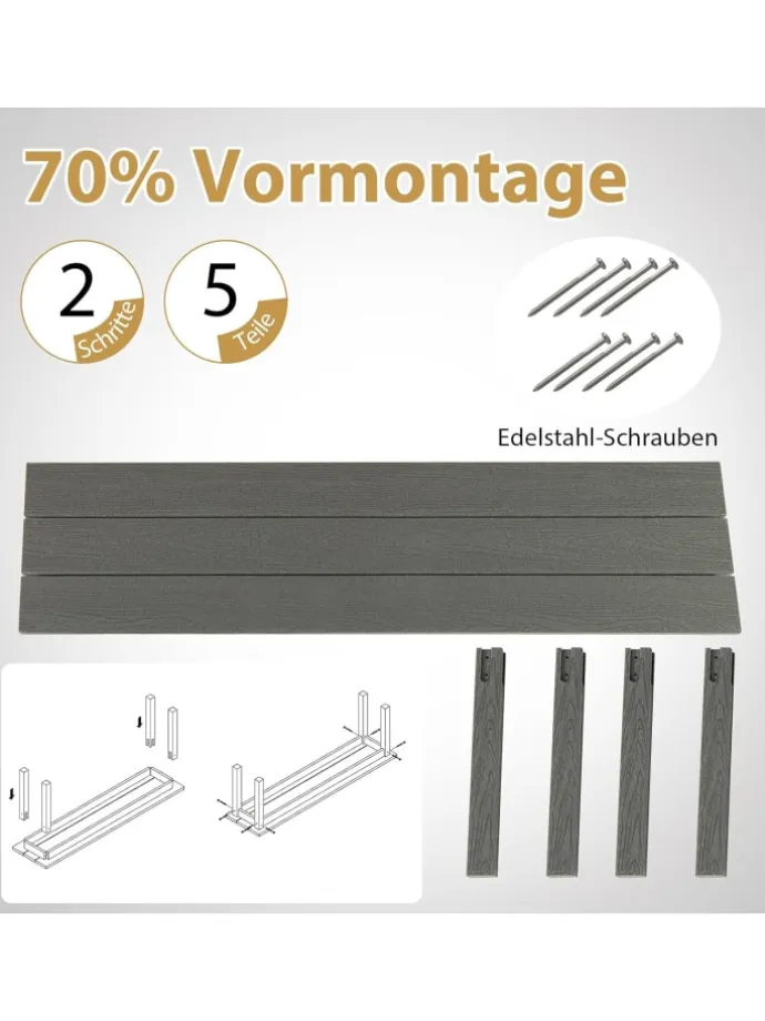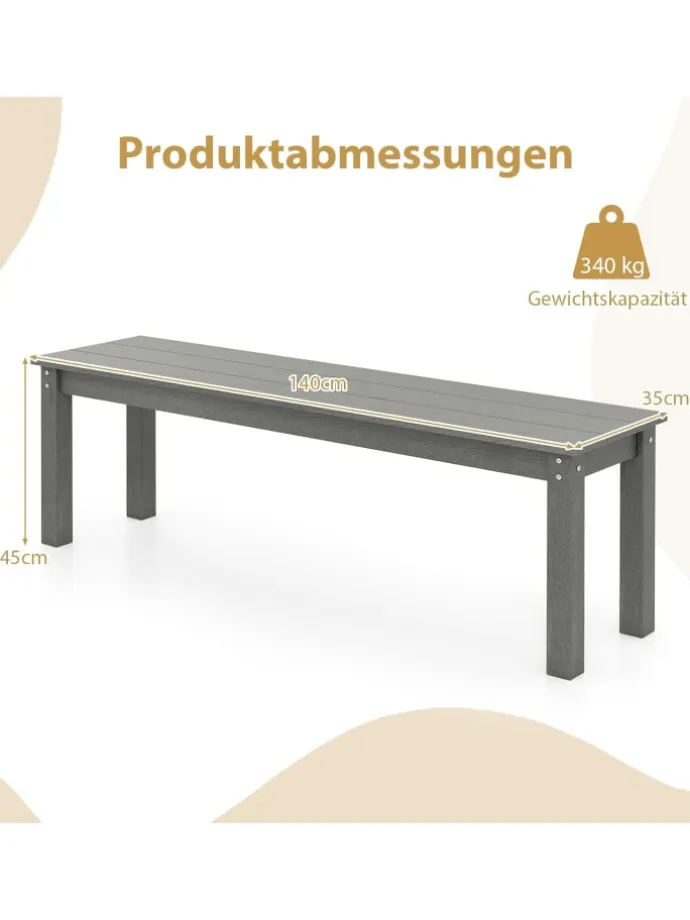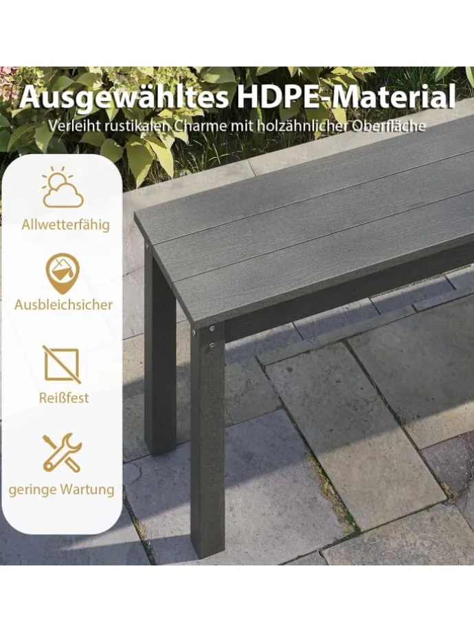 Verbessern Sie Ihr Outdoor-Paradies mit unserer 140 cm HDPE rückenfreien Gartenbank. Dieses Freiluft-Sitzmöbel ist bis zu 70% vormontiert, sodass Sie es fast sofort auf Ihrer Veranda, Ihrem Garten oder Ihrem Deck genießen können. Die holzähnliche Oberfläche verleiht nicht nur einen bezaubernden, rustikalen Charme, sondern besteht auch aus wetterbeständigem HDPE-Material, das sonnenschützend, farbecht und unglaublich pflegeleicht ist. Ausgestattet mit starken Metallquerstreben und dreieckigen Verstärkungen, trägt diese Veranda-Zweisitzerbank bis zu 340 kg, was sie zum idealen Platz für 2-3 Personen macht, um sich zu entspannen und die Natur zu genießen.
