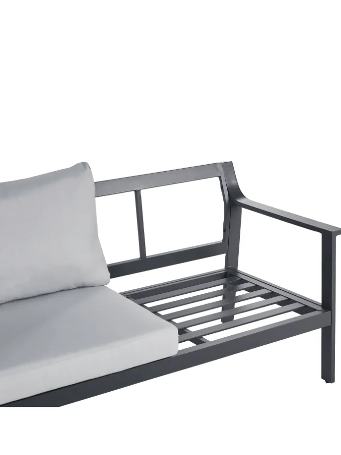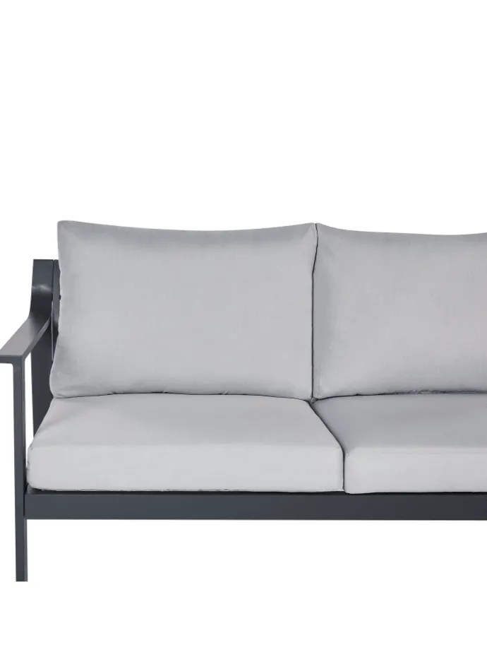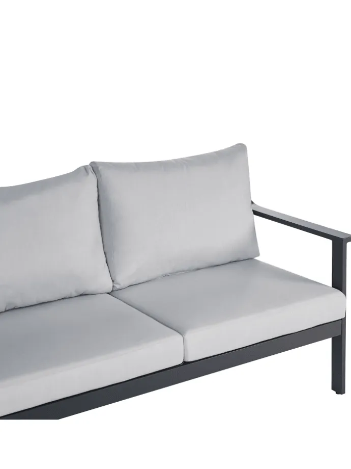 Modernes 3-Sitzer Outdoor-Sofa mit en Polstern und dunkelgrauem Aluminium-Gestell. Wer in Komfort gehüllt im Freien entspannen möchte, der ist mit diesem Polstersofa gut beraten. Die dunkelgraue Pulverbeschichtung steigert die Langlebigkeit der Alu-Konstruktion, während die en Schaumstoff gefüllten Kissen und die hohen Armlehnen für ein optimales Sitzvergnügen sorgen. Die Kissenbezüge punkten nicht nur mit ihrem modernen Farbton, sie sind auch wasserabweisend und UV-beständig. Genießen Sie wohlige Stunden im Außenbereich mit einem Sofa, das für die Ewigkeit gebaut ist.