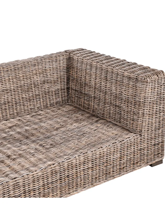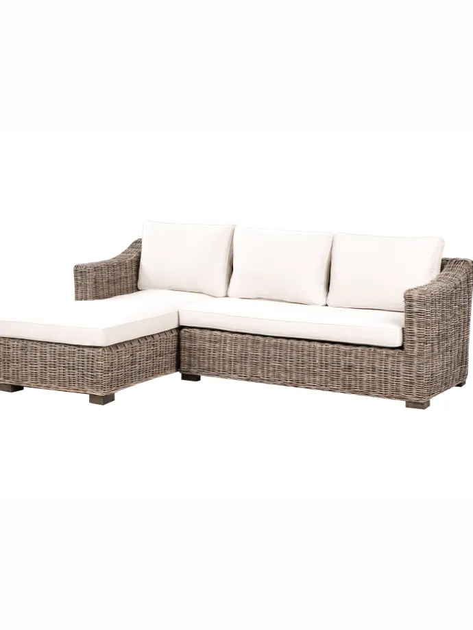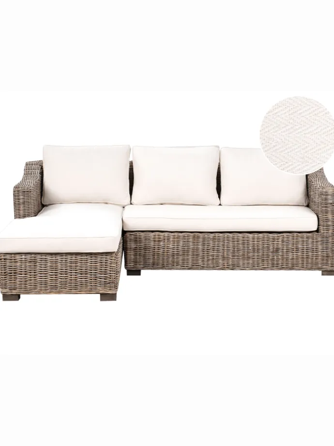 Gartensofa aus Rattan. Dieses klassische Rattan-Ecksofa besticht durch sein zeitloses, geflochtenes Design und verleiht Ihrem Garten oder Zuhause eine klassische Note. Mit Platz für drei Personen sorgt es dank er Polster für besonderen Komfort und Entspannung. Perfekt für gemütliche Stunden im Freien bei schönem Wetter, aber ebenso gut für den Innenbereich geeignet, ist es eine stilvolle und vielseitige Wahl für jedes Ambiente.