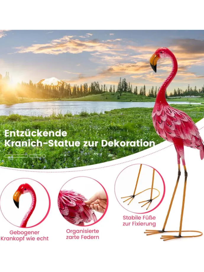 Jede Flamingo/Kranich-Statue hat einen Metallrahmen für eine längere Lebensdauer, der rostfrei und verstärkt ist. Beide der entzückenden Statuen zur Dekoration sind mit einem echt aussehenden gebogenen Flamingokopf/Kranichkopf, organisierten zarten Federn und stabilen Füßen zur Fixierung gestaltet. Als ideale Dekoration für zusätzliche Lebendigkeit eignet sich das Flamingo/Kranich-Deko-Set für Hinterhof, Eingangstor, Seeufer, Innenbereich usw. Die einfache Montage spart Zeit und Mühe. Befolgen Sie einfach diese Schritte, 1. Bereiten Sie beide Teile vor, 2. Stecken Sie den Körper in das Bein, 3. ziehen Sie die Flügelmuttern fest. Produktabmessungen von 18 x 35 x 86 cm (L x B x H) und 19 x 30 x 85 cm (L x B x H).
