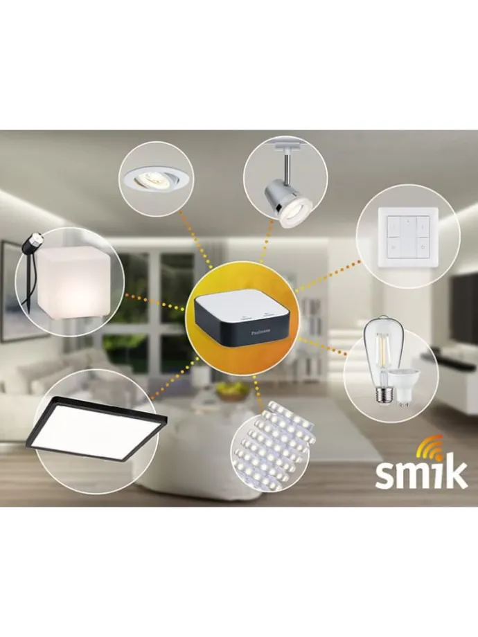 Mit dem Paulmann-smik-Gateway und den Zigbee 3.0-Lösungen von Paulmann lassen sich Haus und Garten smart zum Leuchten bringen. Das neue Paulmann Gateway ist handlich kompakt und fügt sich mit seiner eleganten und schlichten Farbgebung nahtlos in alle Wohnräume ein. Das Licht lässt sich ganz nach den eigenen Wünschen und Bedürfnissen per App, Sprache oder Schalter steuern, von zu Hause oder unterwegs. Ob Einbauleuchten, Schienensysteme oder Leuchtmittel, es lassen sich Szenen für jede Stimmung und Routinen für automatische Abläufe erstellen. Mit den verschiedenen Weißtönen und Millionen von Farben in verschiedenen Helligkeiten lässt sich ein individuelles smartes Licht-Erlebnis schaffen. Lichtprodukte anlernen: Das smik Gateway steuert Zigbee 3.0 Lichtprodukte von Paulmann und von anderen standardkonformen Herstellern (Zigbee 3.0 zertifiziert). Die Lichtprodukte müssen in den Verbindungsmodus gebracht werden, um diese am smik Gateway anlernen zu können. Nach Kauf ist dafür ein Anschalten der Lichtprodukte ausreichend. Wenn Lichtprodukte bereits mit einer anderen Steuerungseinheit als dem smik Gateway verbunden waren (z. B. mit einem anderen Zigbee 3.0 Gateway oder einer Zigbee 3.0 Fernbedienung), müssen diese Lichtprodukte zunächst zurückgesetzt werden. Wie das Zurücksetzen funktioniert, erfährst du beim Hersteller des jeweiligen Lichtprodukts.