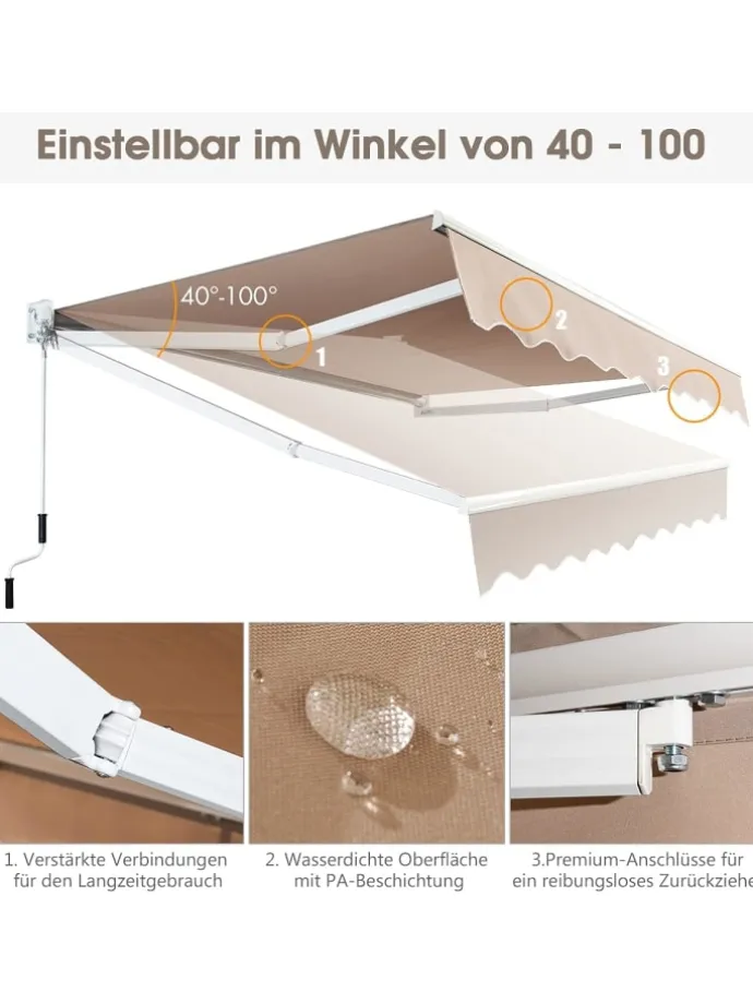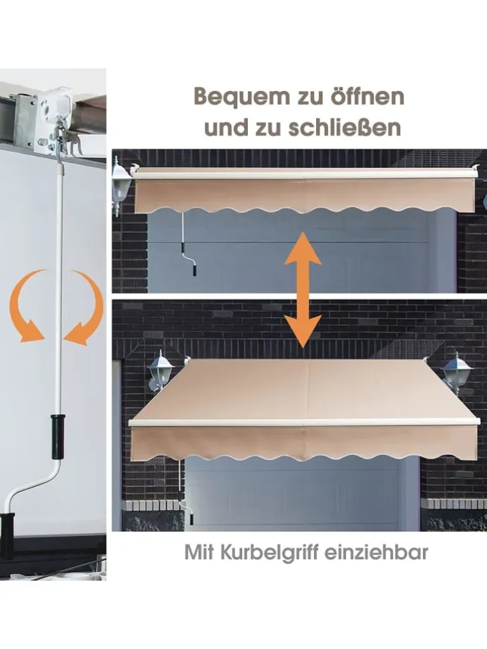 Unsere manuell einziehbare Markise kann durch Drehen der Handkurbel verstellt und auf gewünschter Position fixiert und bis zu ca. 2 m vollständig ausgefahren werden, für optimalen Schutz gegen Sonnenstrahlung. Die aus PolyurethanMaterial gefertigte Markise ist wasserdicht, UV-beständig und leicht zu reinigen. Das solide, pulverbeschichtete Aluminiumgestell sorgt für eine lange Nutzungsdauer, ist überaus robust und bei Wind und Wetter verwendbar. Installieren Sie unsere Sonnenschutz-Markise über der Tür, oder dem Fenster Ihres Balkons, für einen angenehmen Schatten, oder verwenden Sie sie auf Ihrer Terrasse, oder Ihr Café oder Restaurant.