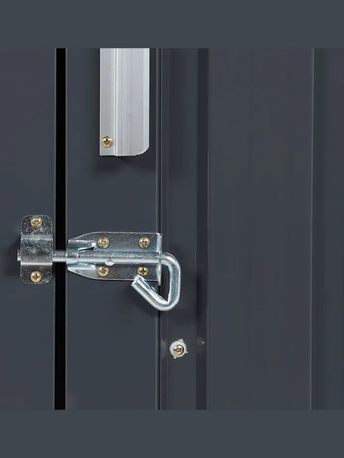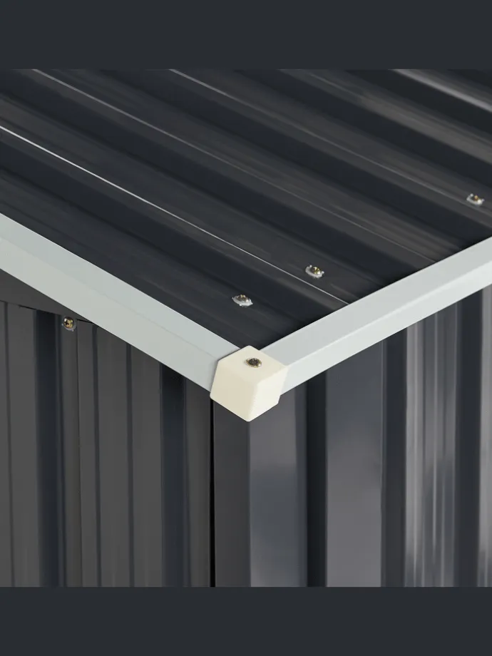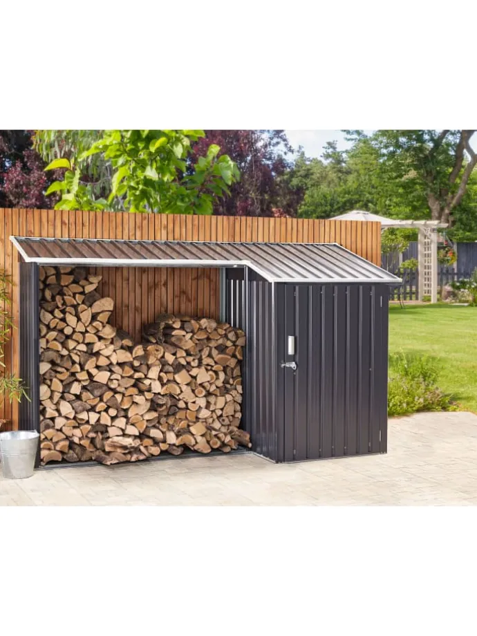 Moderner Geräteschuppen aus Metall mit Holzlager und Pultdach. Mit diesem funktionalen Metall-Gartenschuppen bleibt Ihr Außenbereich immer aufgeräumt. Die Wände des Gartenschranks bestehen aus en verzinkten Stahl-Trapezblech, das zusätzlich pulverbeschichtet wurde. So ist für entsprechende Stabilität, Korrosionsbeständigkeit und Wetterbeständigkeit gesorgt. Sein leicht geneigtes Dach sorgt bei Regenfällen für einen ungehinderten Wasserabfluss. Im Inneren des Schuppens findet sich genügend Platz für alle Gartengeräte, vom Spaten und der Harke bis hin zum Rasenmäher oder dem Mülleimer. Die Tür lässt sich dank des Schieberiegels einfach verschließen, so dass alles Blickdicht versteckt und vor Regen geschützt bleibt. Darüber hinaus liefert der Gerätechrank mti seiner seitlichen Überdachung der besten Ort, dan dem Sie Holzscheite verstauen und trocknen lassen können.