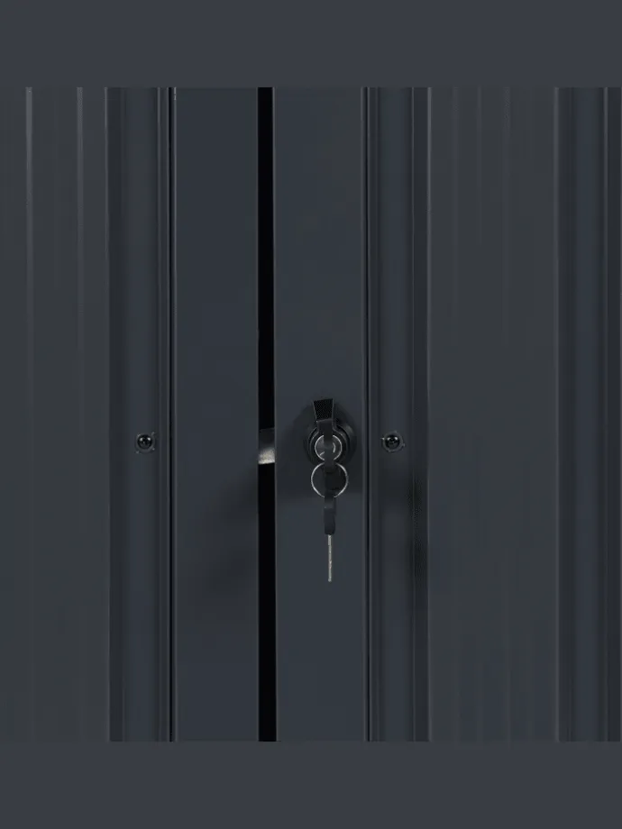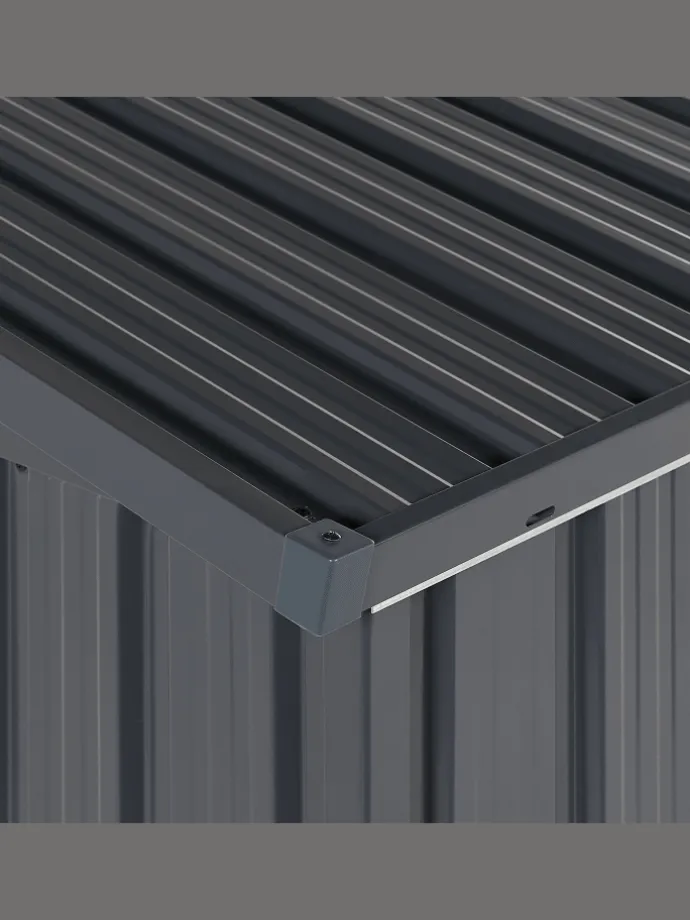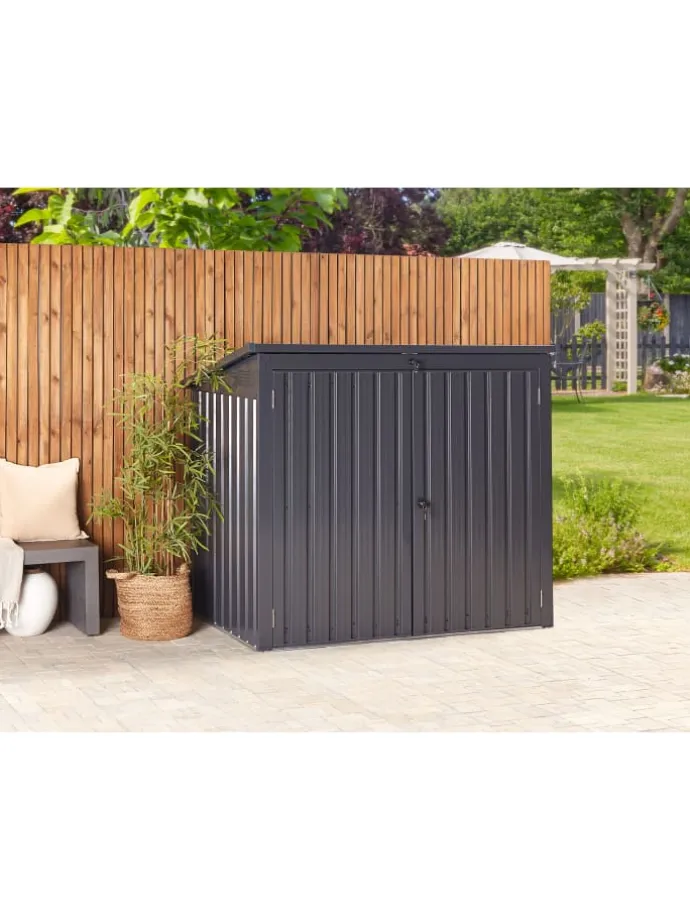 Moderner, abschließbarer Geräteschuppen aus Metall mit 2 großen Türen und hochklappbarem Pultdach. Möchten Sie Ihre Gartengeräte sicher und außer Sichtweite aufzubewahren? Dieser Metallschuppen wird sich mit seinem modernen Design in Ihren Außenbereich perfekt einfügen. Das besondere an dem Modell: Der Metallschrank ist multifunktional und kann als Verkleidung für Mülltonnen, als Versteck für verschmutzte Gummistiefel oder für Gartengeräte genutzt werden. Der Geräteschrank verfügt über Doppeltüren, die Ihnen erlauben auch mal etwas Größeres zu verstauen. Zudem lässt sich der Schuppen auch von oben öffnen, was besonders praktisch ist, wenn sie ihn als Mülltonnenverkleidung nutzen oder Sie etwas schnell ins Innere legen möchten. Der stabile Deckel lässt sich mit Hilfe eines Schlüssels verschließen und dank einer Gasdruckfeder leicht öffnen. Die Wände des Gartenschranks bestehen aus en verzinkten Stahl-Trapezblech, das zusätzlich pulverbeschichtet wurde. So ist für entsprechende Stabilität, Korrosionsbeständigkeit und Wetterbeständigkeit gesorgt.