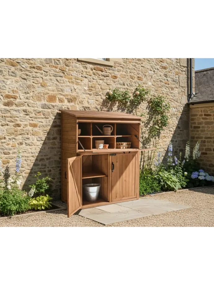 Holz-Werkzeugschuppen für den Garten. Dieser geräumige Gartenschuppen ist die ideale Aufbewahrungslösung für jeden Außenbereich. Er ist aus hochwertigem Tannenholz in einem warmen Braunton gefertigt und verfügt über zahlreiche Regale in verschiedenen Größen zur Organisation von Werkzeugen, Gartengeräten oder Töpfen. Darüber hinaus bieten die Türen mit Verriegelung zusätzliche Sicherheit.