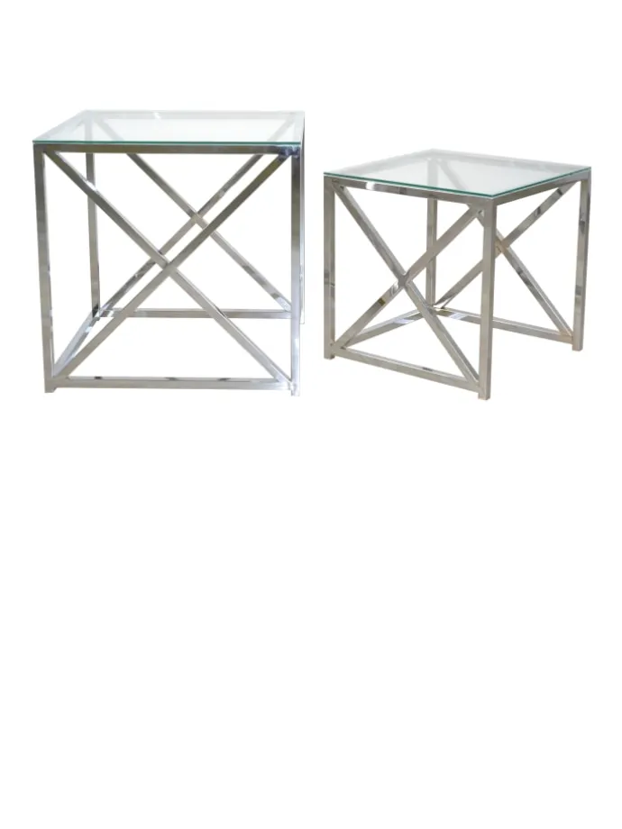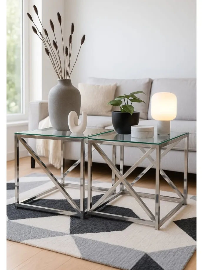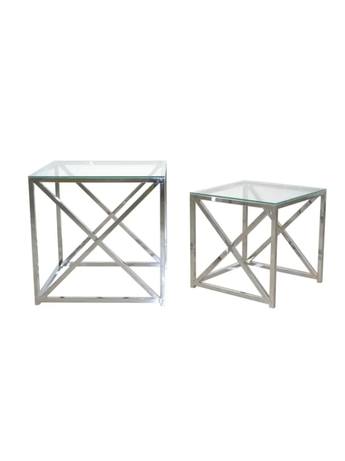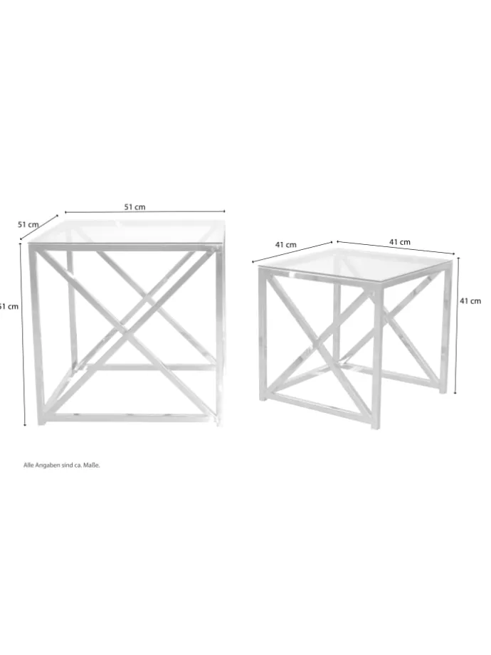 Moderne Glastische im 2er-Set mit einem hochwertigen, verchromten Stahlrohrgestell, oben aufgelegt jeweils eine ca. 0,5 cm starke Sicherheits-Klarglasplatte. Der kleine Glastisch lässt sich ohne Probleme unter den größeren schieben, bzw. beide Tische, versetzt gestellt, bieten Ihnen reichlich Platz. Artikel zerlegt, mit Aufbauanleitung. Maße ca. cm: B. 51 x T. 51 x H. 51 cm und B. 41 x T. 41 x H. 41 cm. Einzeln stellbar, oder als praktisches Tischset, nebeneinander versetzt stellbar.