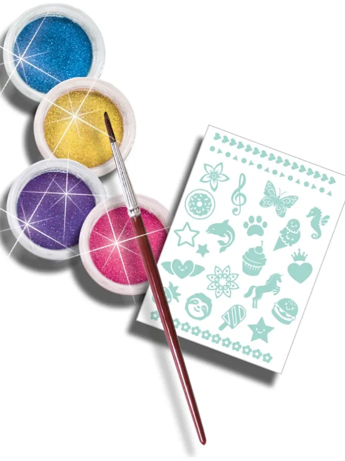 – Inhalt: Tattoo-Aufkleber, 4 Glitzerfarben, 1 Pinsel, Anleitung