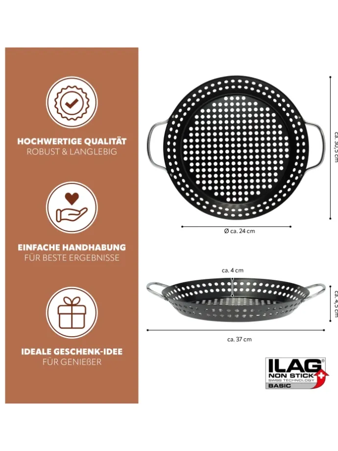 Die stabile Grillplatte ist innen und außen mit ILAG® antihaftbeschichtet für schonendes Grillen ohne Anhaftung und eine leichtere Reinigung per Hand. Auf gängigen Grillgeräten einsetzbar bei Temperaturen bis 220° C.