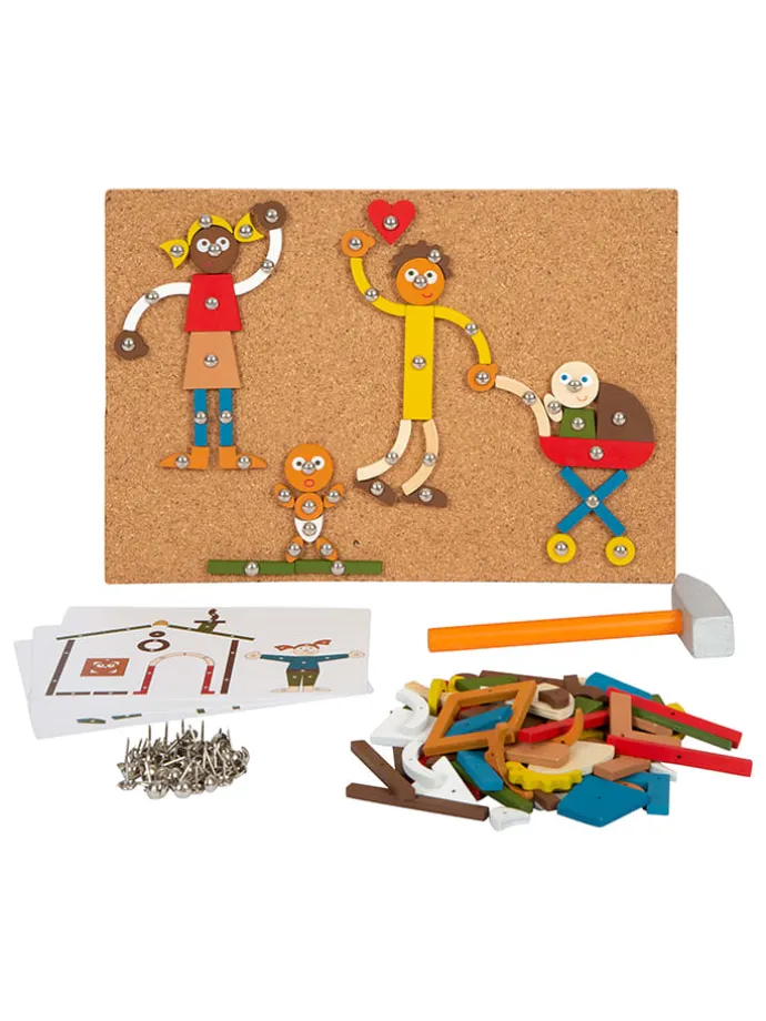 – Inhalt: 1 Korkplatte, 1 Hammer, 3 Vorlagekarten, 137 Nägel, 145 Plättchen