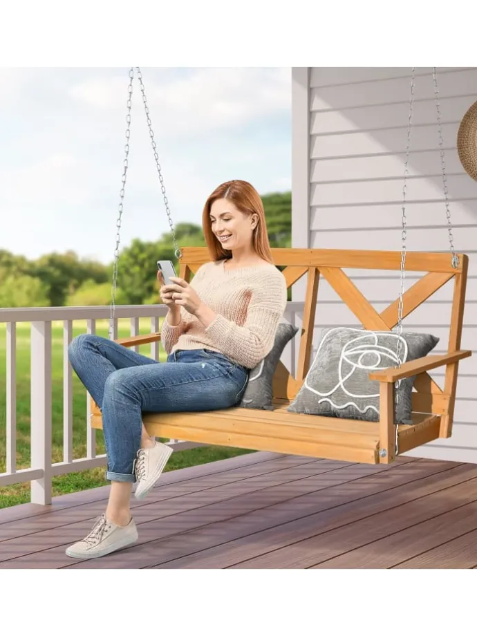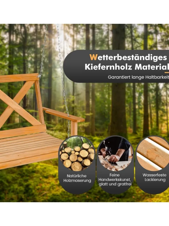 Die Hollywoodschaukel misst 134 x 60 x 65 cm (L x B x H) und bietet Platz für bis zu 2 Personen, sodass Sie eine entspannte Zeit mit Ihrer Familie oder Freunden genießen können. Darüber hinaus ist sie aus ausgewähltem Kiefernholz gefertigt und mit einer wasserfesten Lackierung versehen, die sich durch hervorragende Wetterbeständigkeit und Robustheit auszeichnet und eine langfristige Verwendung im Freien gewährleistet. Zudem verfügt sie über 2 hochfeste Aufhängeketten und Karabiner, die eine große Tragfähigkeit von 240 kg gewährleisten. Sie können sie auf der Veranda oder an einem Baum hängen oder mit einem Schaukelgestell (nicht im Lieferumfang enthalten) für Ihren Garten oder Rasen kombinieren und so eine tolle Zeit zum Entspannen verbringen!