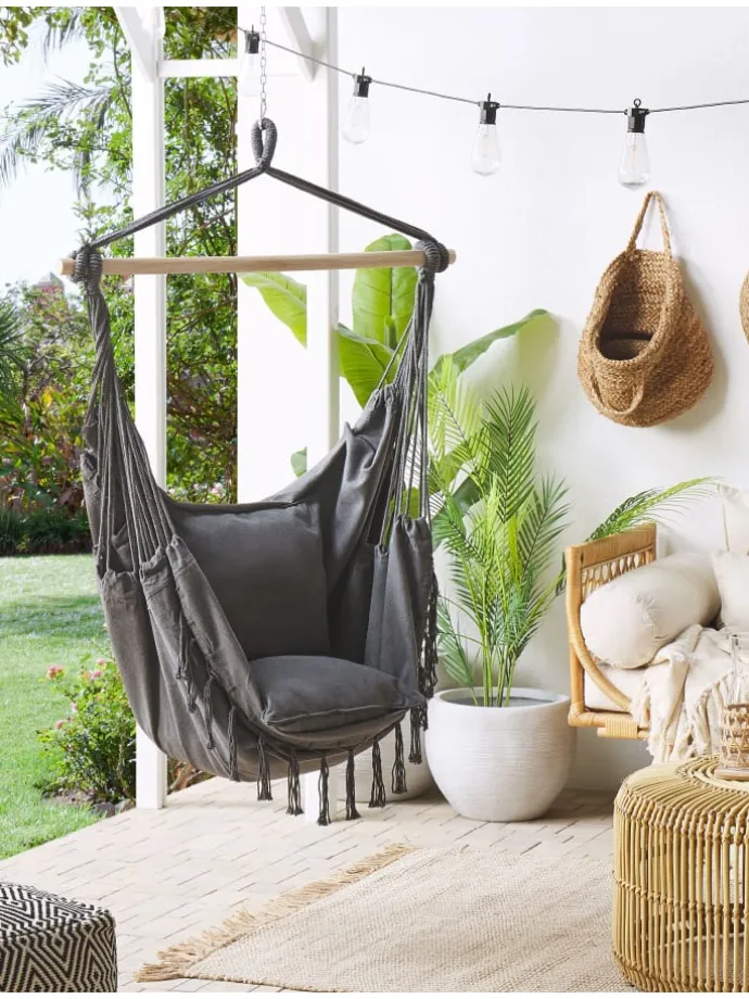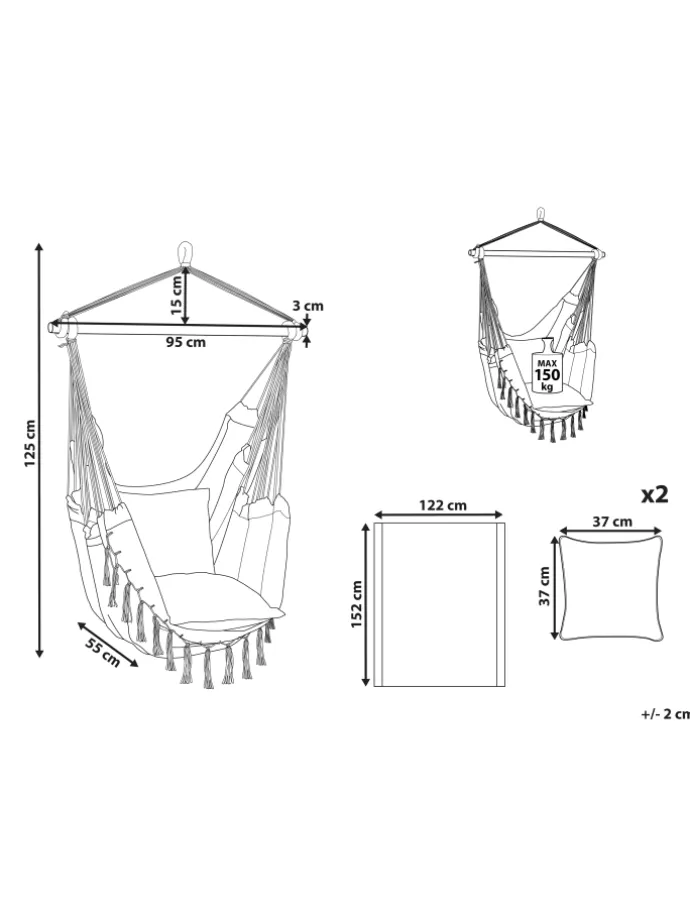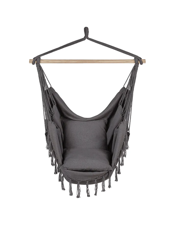 Wunderschöner brasilianischer Stuhl in Boho still. Dieser hübsche und funktionelle Hängesessel ist der perfekte Hingucker für eine Veranda oder einen Wohnbereich. Die Sitzfläche ist aus robustem, hochwertigem Stoff gefertigt und mit stilvollen Quasten am Rand verziert, die für einen Boho-Flair sorgen. An einer Seite befindet sich eine kleine Tasche, die ideal für Gläser oder ein Buch geeignet ist. Zusammen mit den passenden Kissen, die im Lieferumfang enthalten sind, ist die Hängeschaukel ein idealer Platz, um sich einzukuscheln, ein Buch zu lesen oder einfach zu entspannen.