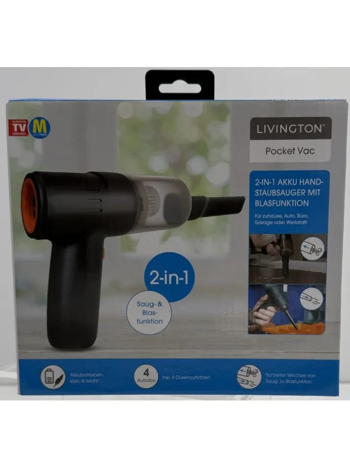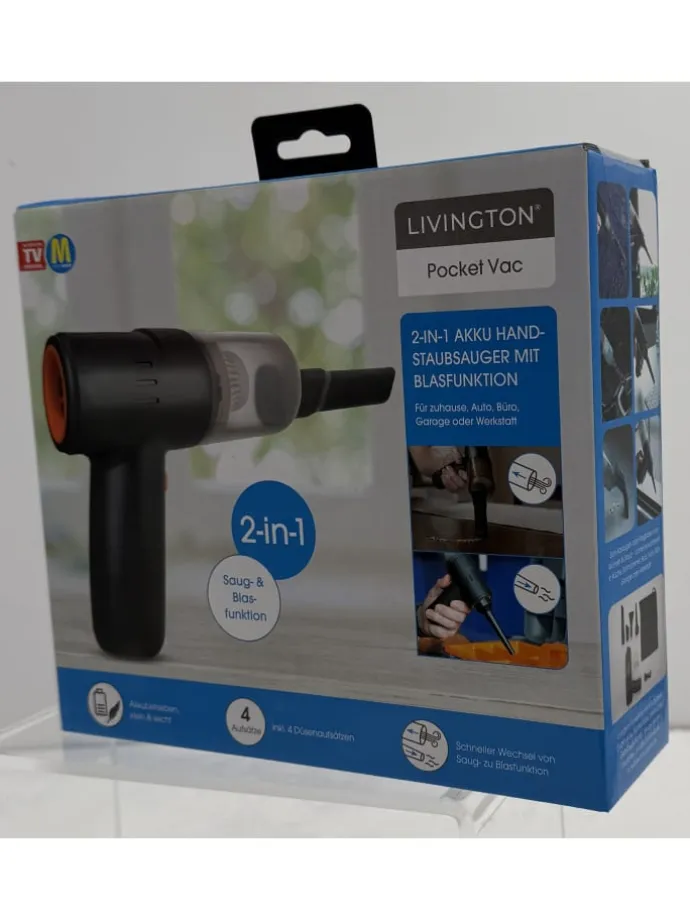 Entdecken Sie den Livington PocketVac, den kabellosen, multifunktionalen Handstaubsauger, der mit kraftvoller Saug- und Blas-Funktion jeden Reinigungsbedarf abdeckt. Ideal zum schnellen Absaugen oder Wegblasen von Krümeln und Staub – sei es auf dem Sofa, in Schränken, am Arbeitsbereich, im Auto oder an schwer zugänglichen Stellen. Mit dem Livington PocketVac wechseln Sie sekundenschnell vom Staubsauger zum Bläser und genießen maximale Flexibilität. Dank seines extrem leichten Designs liegt er perfekt in der Hand und ermöglicht müheloses Reinigen. Er ist schnell und einfach zu entleeren und verfügt über einen waschbaren Filter für langanhaltende Sauberkeit. Das kompakte Design des Livington PocketVac ermöglicht eine einfache und schnelle Verstauung, sodass er immer griffbereit ist. Perfekt für den Einsatz zu Hause, im Auto, im Büro, in der Garage oder in der Werkstatt. Mit dem umfangreichen Zubehör, bestehend aus Bürstendüse, breiter Düse, Fugendüse, Gebläseaufsatz und Ersatzfilter, sind Sie für zahlreiche Reinigungsanwendungen bestens ausgestattet. Erleben Sie die Vielseitigkeit und Leistungsfähigkeit des Livington PocketVac – Ihr perfekter Partner für schnelles und effizientes Reinigen überall und jederzeit!