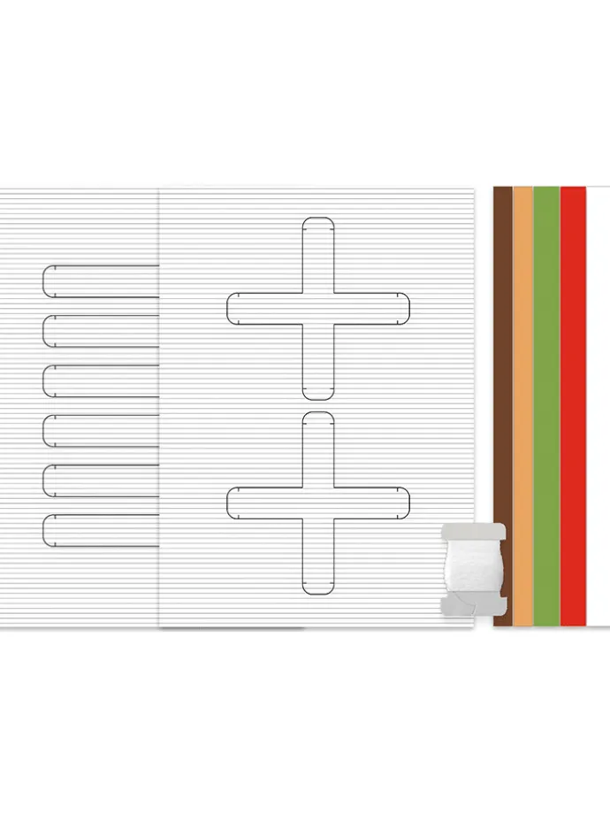 – Inhalt: 3 Blätter Fotokarton (mit je 2 verschiedenen Motiven gelasert), 6 Blätter Tonzeichenpapier (gelasert, in verschiedenen Farben sortiert) mit je 16 Streifen (15 mm breit) und Bastelanleitung