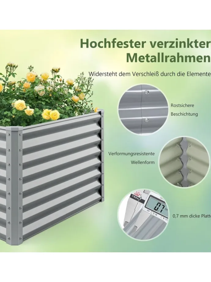 Unser großzügiges 60 cm hohes Hochbeet bietet Ihnen ultimativen Komfort bei der Gartenarbeit. Es bietet reichlich Platz für eine Vielzahl von Pflanzen und sorgt für eine üppige, reiche Ernte. Der offene Boden fördert optimale Luftzirkulation und Wasserableitung, während die hochwertige, spritzbeschichtete Plattenkonstruktion für Rostbeständigkeit und Formbeständigkeit sorgt. Dank der robusten, verstärkten Stäbe und des verstärkten Eckschutzes ist dieses Hochbeet zudem langlebig und bietet Ihren Pflanzen ein stabiles und robustes Gerüst für ein gedeihendes Wachstum. Dank unserer leicht verständlichen Anleitung ist der Aufbau kinderleicht, und die glatte Oberfläche erfordert nur minimalen Pflegeaufwand – die ideale Wahl für jeden Gartenliebhaber.