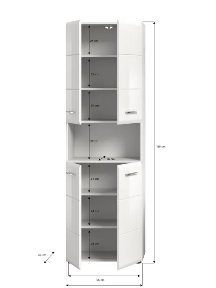 Entdecken Sie unseren geräumigen Badezimmer Hochschrank in strahlendem Weiß, mit hochglänzenden tiefgezogenen Elementen für zeitlose Eleganz. Mit den großzügigen Maßen von 60x185x30 cm bietet er nicht nur viel Stauraum für Ihre Badutensilien, sondern setzt auch einen modernen Akzent in Ihrem Badezimmer.