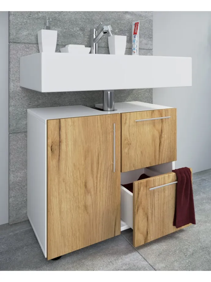 Der VCM Waschtischunterschrank „Flandu“ in Holzstruktur-Nachbildung fügt sich jedes Badezimmer perfekt ein. Der Unterschrank kann durch weitere Badmöbel aus der „Flandu-Serie ergänzt werden.