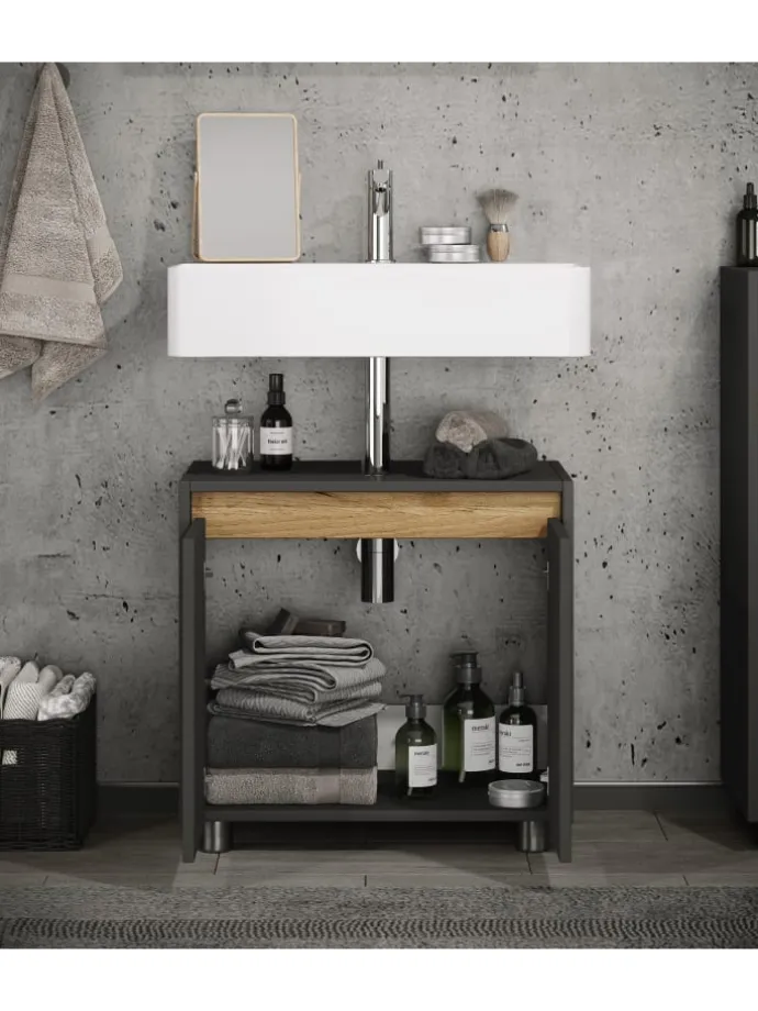Der „Cosila“ Waschbeckenunterschrank lässt sich perfekt in jedes Badezimmer integrieren und bietet sowohl praktischen Stauraum als auch eine ansprechende Optik. Setzen Sie auf Qualität und modernes Design – mit diesem Badschrank schaffen Sie eine angenehme Atmosphäre und profitieren von zusätzlichem Stauraum!