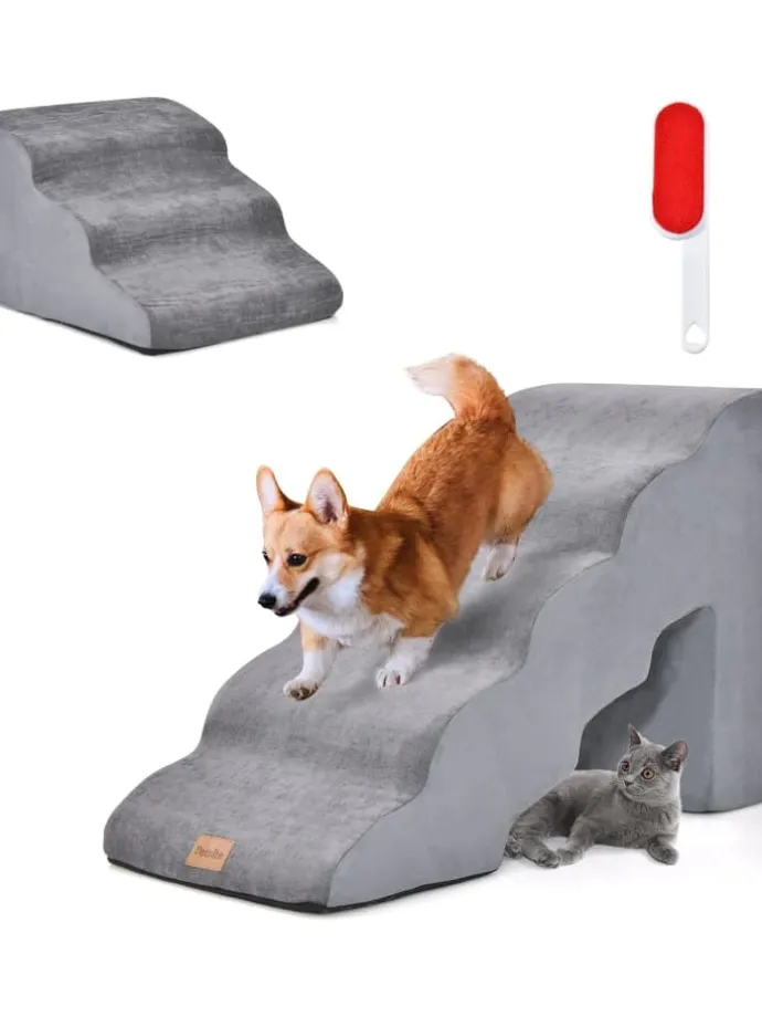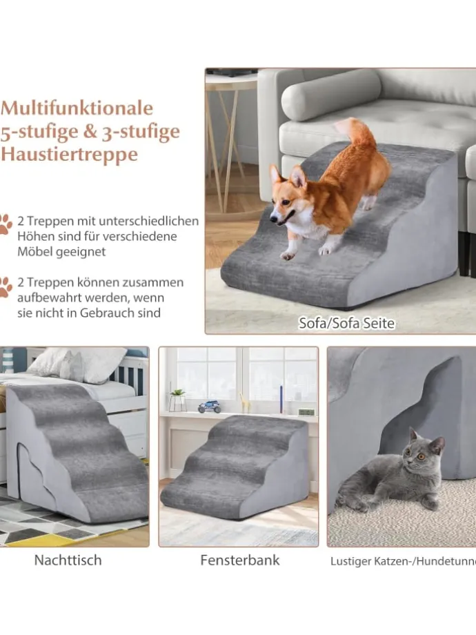 Bieten Sie Komfort und Vielseitigkeit für Sie und Ihren pelzigen Freund! Unser 2-in-1-Rampenset für Haustiere umfasst eine 5-stufige Hunderampe und eine 3-stufige Hunderampe. 2 Treppen mit unterschiedlichen Höhen eignen sich für verschiedene Möbel und können bei Nichtgebrauch zusammen verstaut werden. In einer Vakuumkompressionsverpackung transportiert, nehmen diese Rampen innerhalb von 24–48 Stunden wieder ihre ursprüngliche Form an.