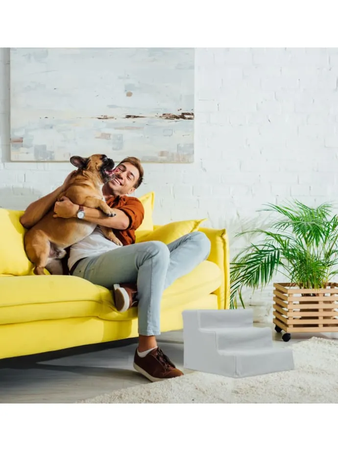 Wenn Ihr Vierbeiner seinen Schlaf- oder Kuschelplatz auf dem Sofa oder im Bett hat, dann ist die Hundestiege ein nützliches Hilfsmittel. Einfach an die Couch oder das niedrige Boxspringbett gelehnt, erleichtert die Hunderampe Ihrer Fellnase den Auf- und Abstieg. Ohne zu springen oder von Ihnen hochgehoben werden zu müssen, gelangen auch alte oder kranke Hunde sowie Katzen gelenk- und rückenschonend auf das Möbel. Dank des waschbarem Polyester-Bezugs ist das Treppchen schonend zu den Pfoten.