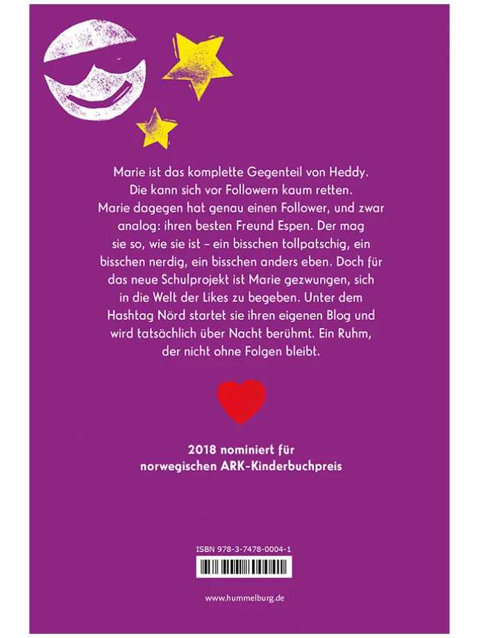 Marie ist das komplette Gegenteil von Heddy. Die kann sich vor Followern kaum retten. Marie dagegen hat genau einen Follower, und zwar analog: ihren besten Freund Espen. Der mag sie so, wie sie ist – ein bisschen tollpatschig, ein bisschen nerdig, ein bisschen anders eben. Doch für das neue Schulprojekt ist Marie gezwungen, sich in die Welt der Likes zu begeben. Unter dem Hashtag Nörd startet sie ihren eigenen Blog und wird tatsächlich über Nacht berühmt. Ein Ruhm, der nicht ohne Folgen bleibt.