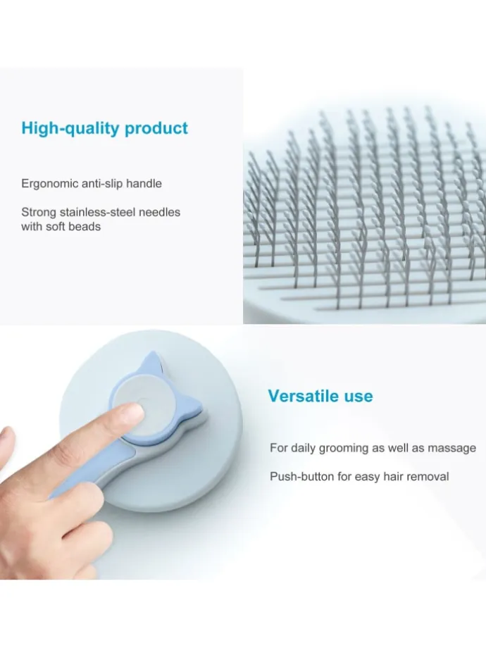 Unsere Tierhaarbürste zeichnet sich durch ein intelligentes Design aus: Sie ist selbstreinigend! Ein einfacher Druckknopf ermöglicht das problemlose Entfernen der Tierhaare von den Nadeln.