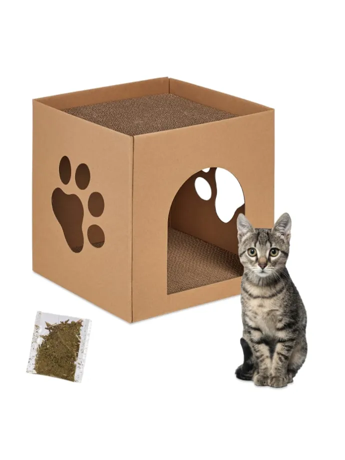 Es gibt wohl kaum eine Katze, die es nicht liebt in einem Karton zu sitzen. Warum diesen nicht zum Katzenhaus machen? Dieser Bausatz macht es möglich. Das Katzennest selbst dient als spannender Rückzugsort und überzeugt mit seinem modernen Design, der großen Tür und den Fenstern in Pfotenform. Locke Deinen Stubentiger mit der Katzenminze zur Kratzpappe im Inneren, sodass er sich mit der Katzenhöhle vertraut machen kann. Natürlich kann Deine Fellnase auch die Dachterrasse zum Relaxen nutzen.