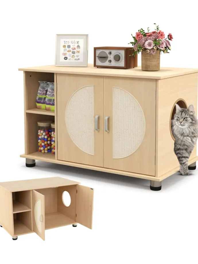 Unser Katzentoilettengehäuse zeichnet sich durch ein natürliches und elegantes Aussehen aus und eignet sich nicht nur als praktischer Schrank zum Verstecken von Katzentoiletten, sondern ist auch eine perfekte Ergänzung für Ihre Inneneinrichtung. Dieses Katzenhaus ist mit doppelten Sisal-Kratztüren ausgestattet und bietet einen speziellen Platz, um die Kratzbedürfnisse von Katzen zu befriedigen.