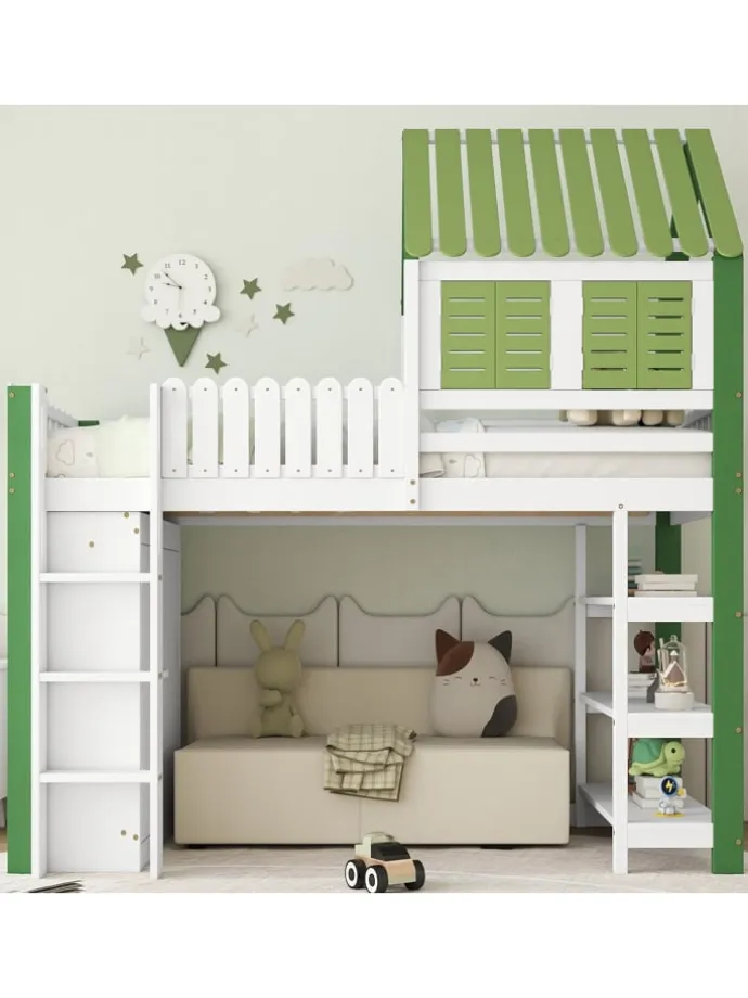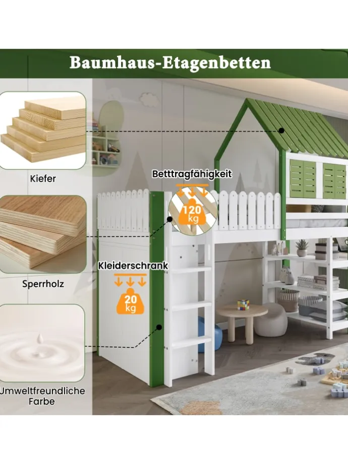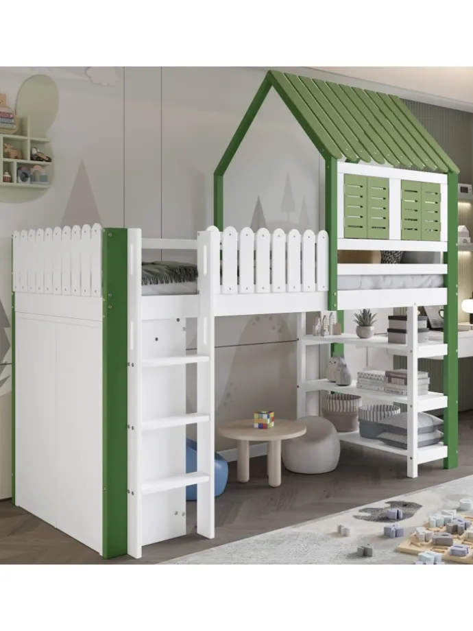 Kinder-Hochbett mit Dach & Stauraum | Weiß/Grün | 90×200 cm