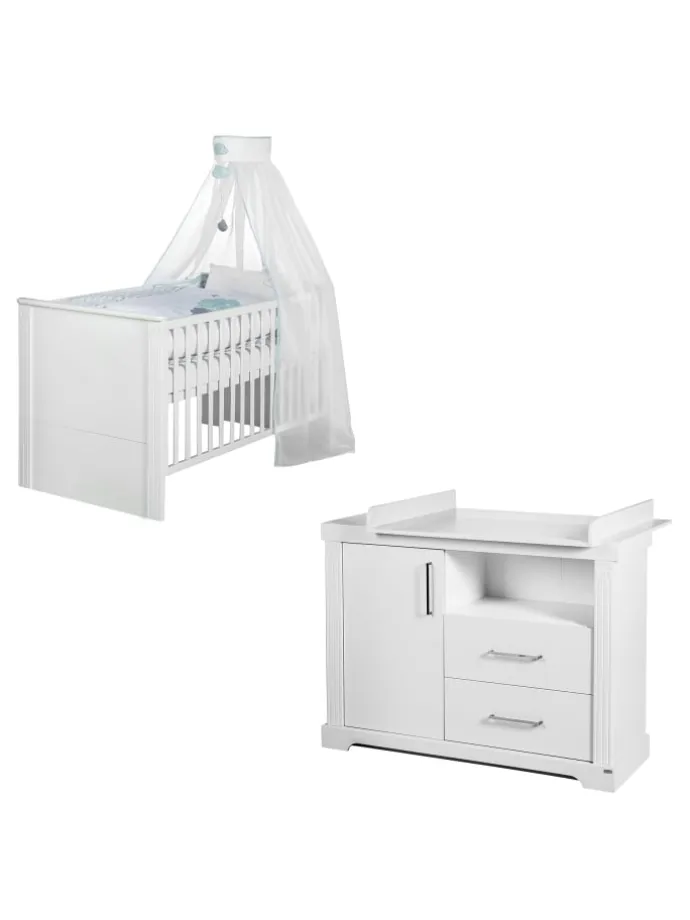 Das roba Kinderzimmerset ‚Maxi‘ überzeugt mit seinem modernen Look mit Korpus im Dekor ‚Weiß‘ und Fronten im Dekor ‚Canadian White‘. Das Set besteht aus einem Kombi-Kinderbett und einer breiten Wickelkommode. Das mitwachsende Kinderbett kann mit den separat erhältlichen Umbauseiten (Art. Nr.: 10011WE) zum Juniorbett umgebaut werden. So findet es bis zum 7. Lebensjahr (bzw. einem Gewicht von 50 kg) Verwendung. Besonders angenehm um Ihr Baby aus dem Bett zu heben ist die obere Position des 3-fach höhenverstellbaren Gitterbetts. Die 3 herausnehmbaren Schlupfsprossen ermöglichen Ihrem Kind den sicheren Ein- und Ausstieg. Die breite Wickelkommode mit Wickelansatz macht mit ihrer angenehmen Wickelhöhe von 90 cm die Babypflege für Eltern und Baby zum Vergnügen. Durch das offene Fach ist bei der Babypflege alles griffbereit. Ohne Wickelansatz dient der Wickeltisch als Kommode. Die Kindermöbelserie ‚Maxi‘ ist in Deutschland entwickelt und in der EU produziert. Maße Bett H x B x T: 84 x 77 x 147 cm. Liegefläche 70 x 140 cm. Maße Wickelkommode H x B x T: 98 x 120 x 75 cm.