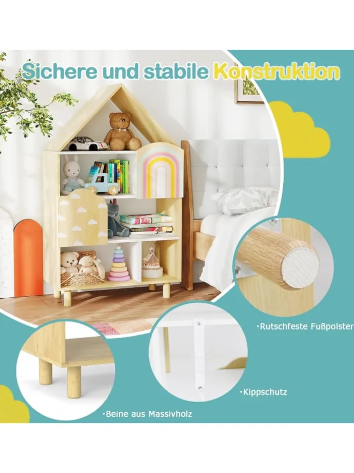 Entworfen mit 5 Fächern und 2 Schränken, kann der hausförmige Spielzeugorganisator als Bücherregal oder Spielzeugaufbewahrungsbereich verwendet werden, um die Gegenstände der Kinder gut zu organisieren. Die Hausform und die niedlichen Muster machen es zu einem echten Hingucker im Kinderzimmer, Lesezimmer, Spielzimmer und mehr. Mit den Maßen 60 x 30 x 103 cm (L x B x H) ist das Puppenhaus Bücherregal für xx Jahre alte Jungen und Mädchen geeignet. Zudem verhindern die stabilen massiven Holzbeine und das Anti-Kipp-Design Wanken oder Zusammenfallen. Die Anti-Rutsch-Fußpads erhöhen die Gesamtsicherheit und schützen den Boden vor Kratzern.